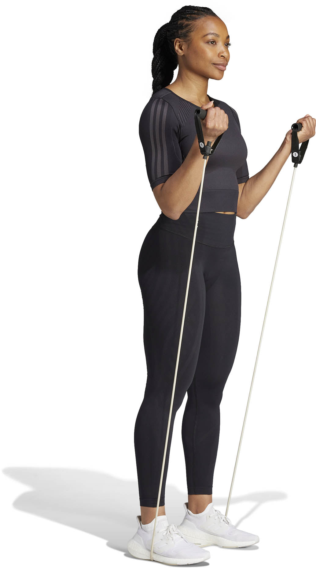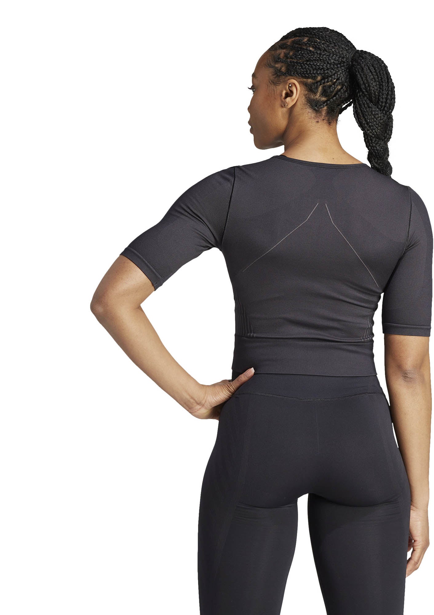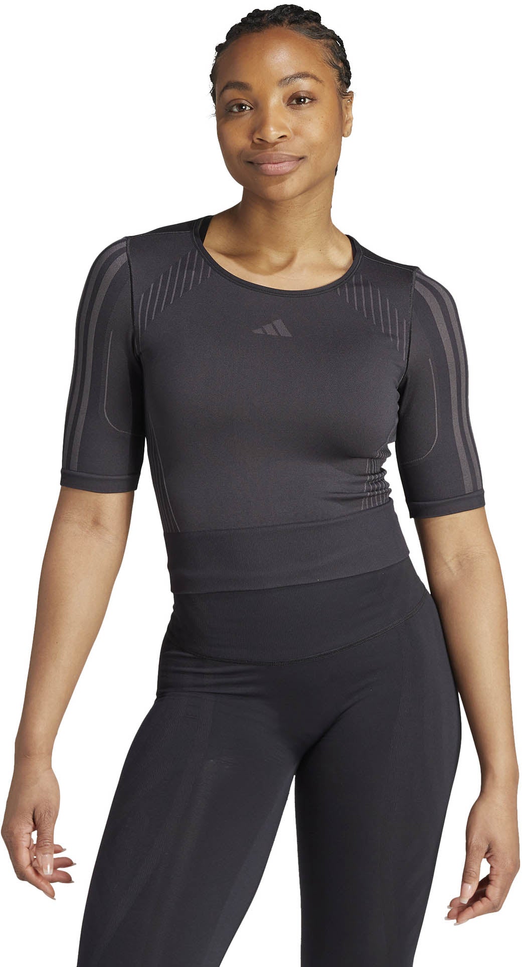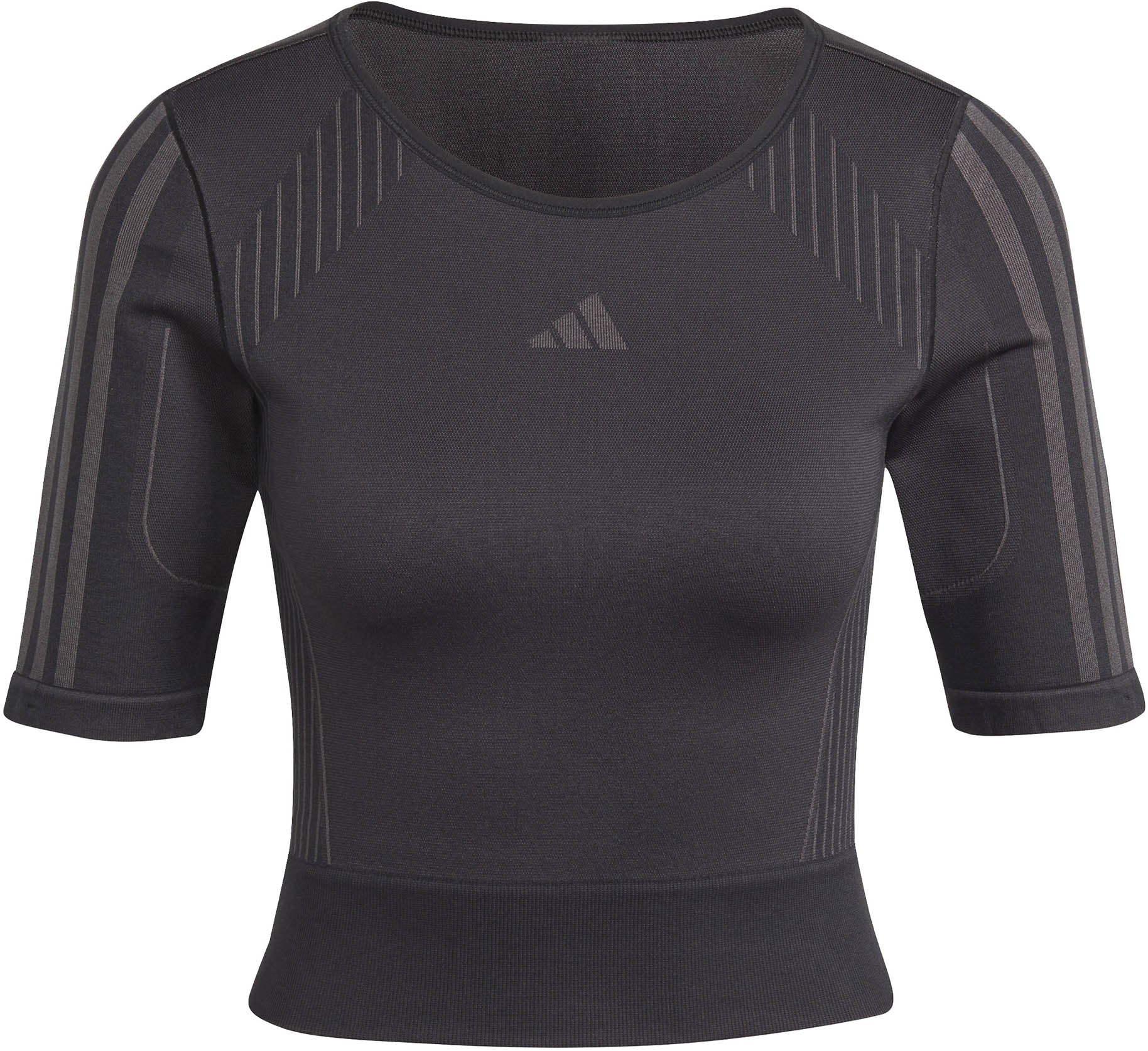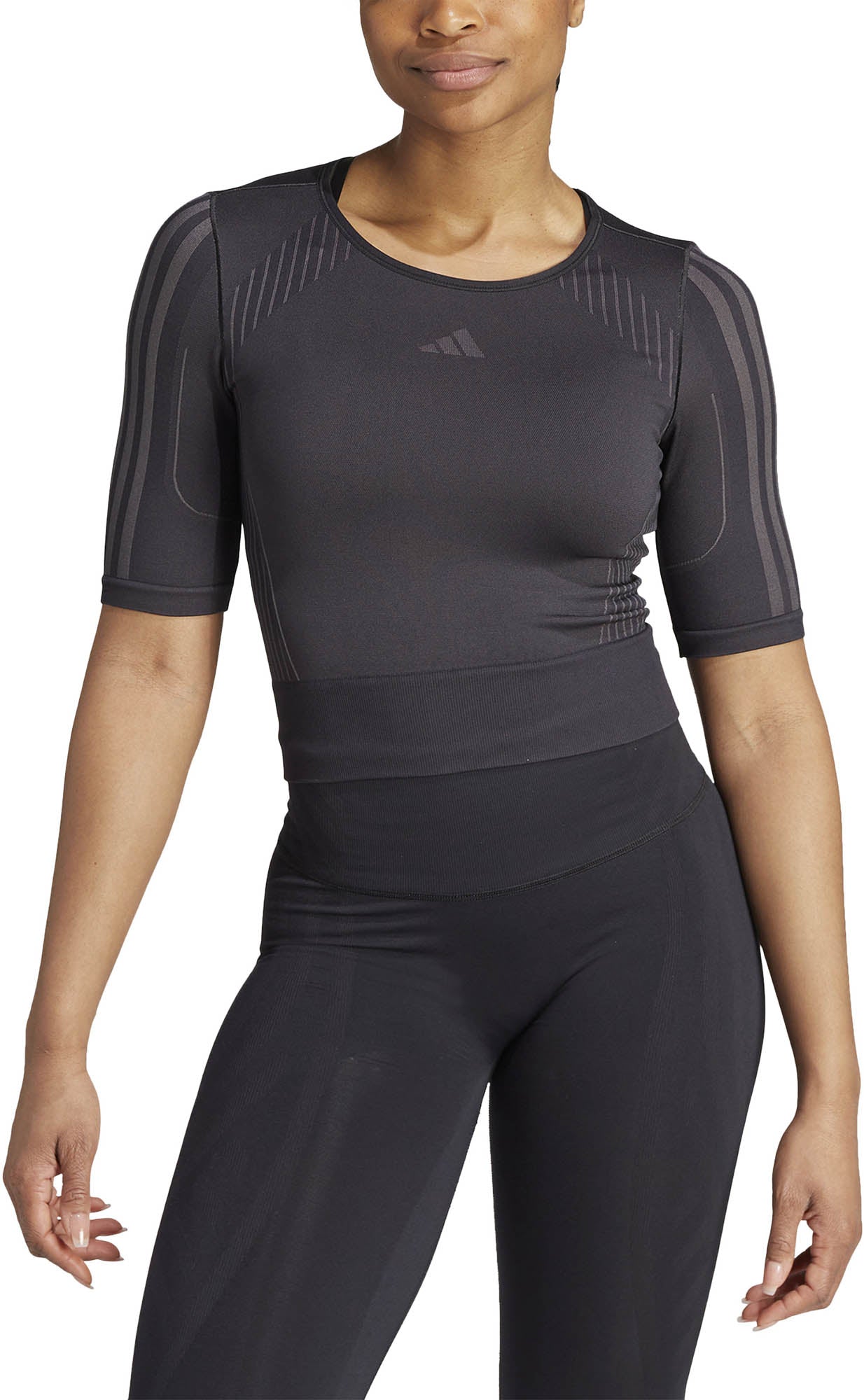 Een klassieke ronde hals en strakke pasvorm geven dit adidas T-shirt een stijlvolle uitstraling, en de manier waarop het is gemaakt geeft 't slimme functionaliteit. adidas AEROKNIT combineert vochtbeheersing met een performance-knit om je krachtig in beweging te houden. De stretchy nylon-polyestermix is licht en robuust, en de naadloze constructie vermindert schuren en irritatie. Contourlijnen flatteren je figuur en zorgen ervoor dat je vrij en makkelijk kunt bewegen.
