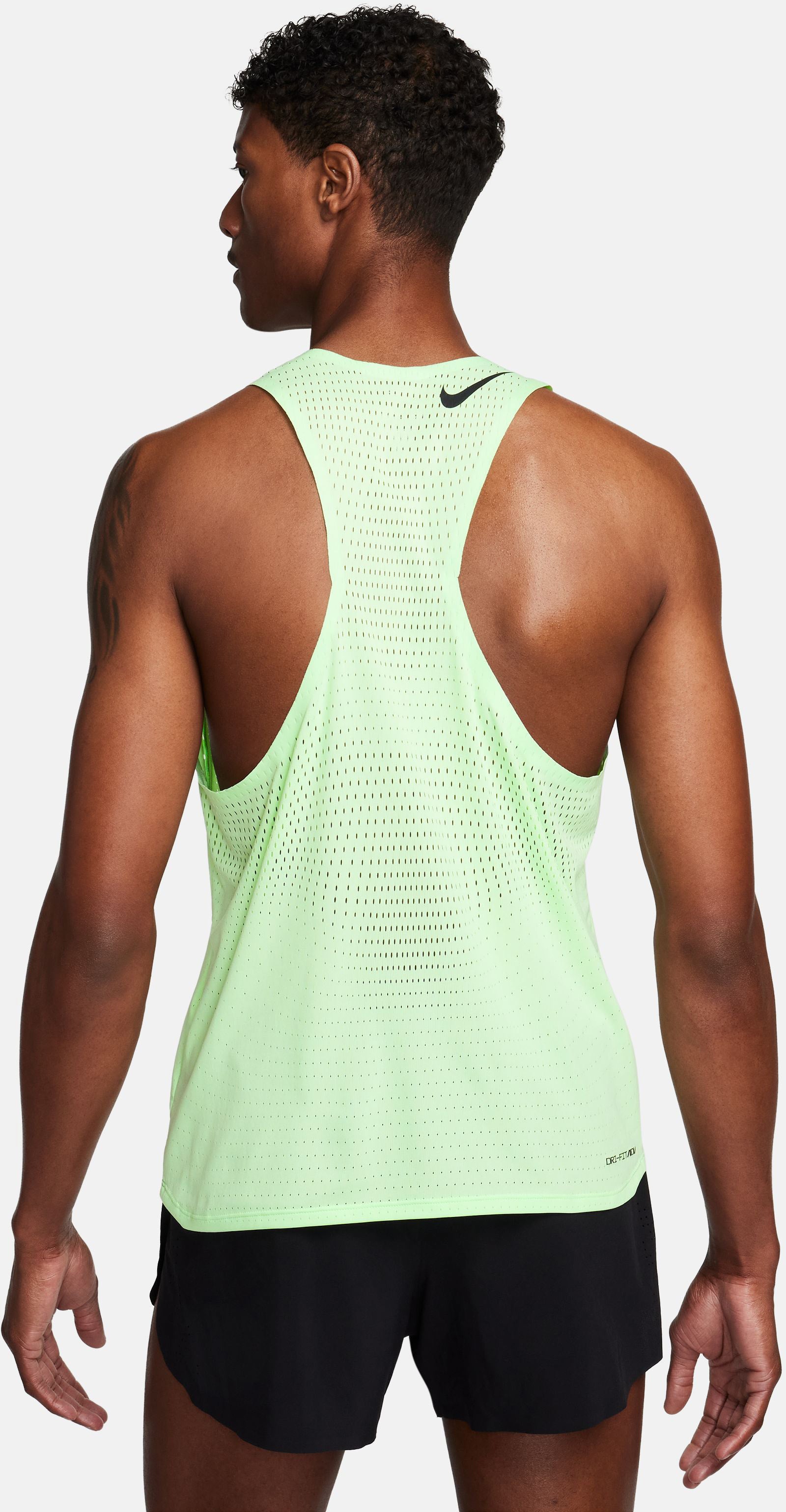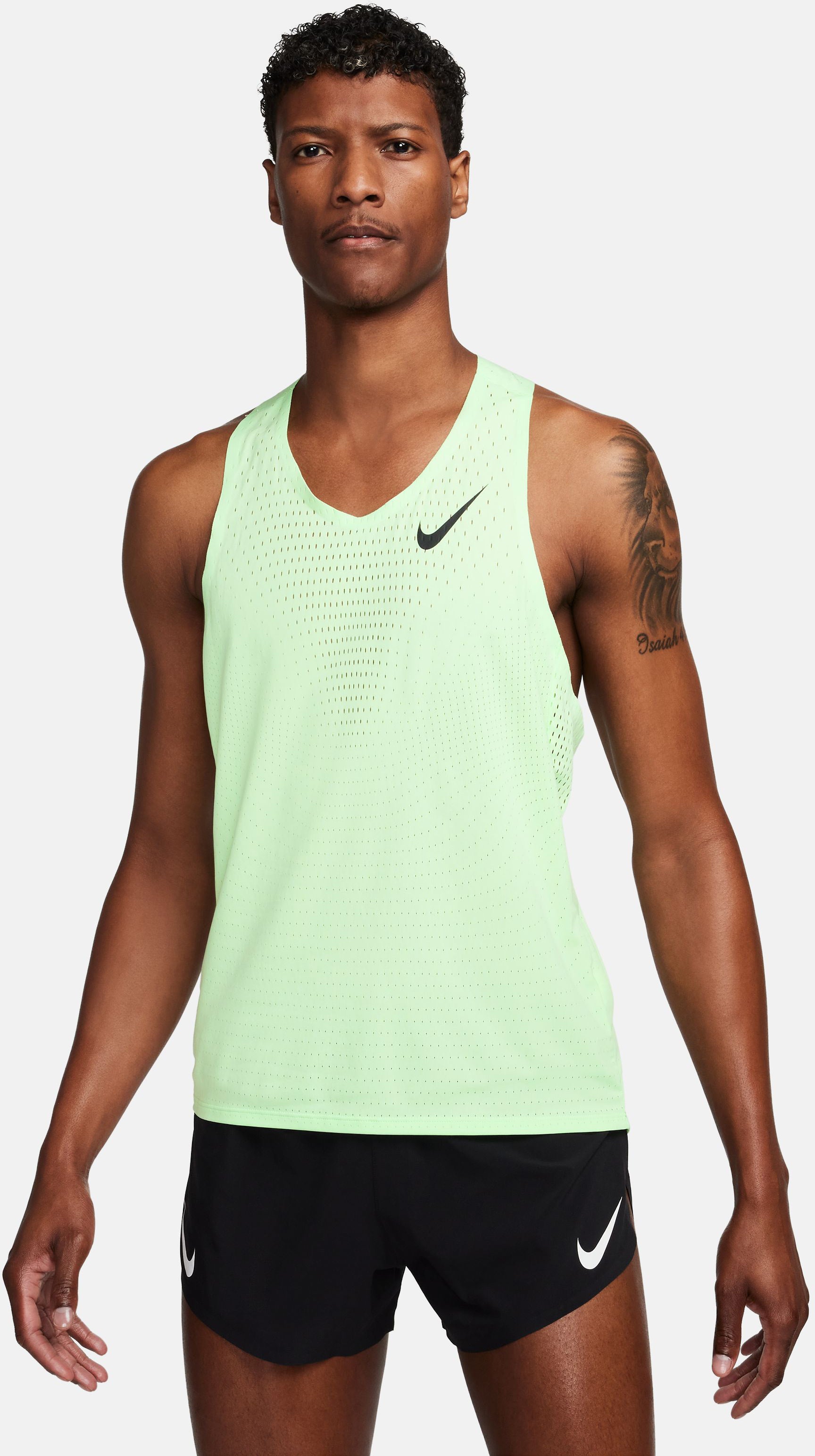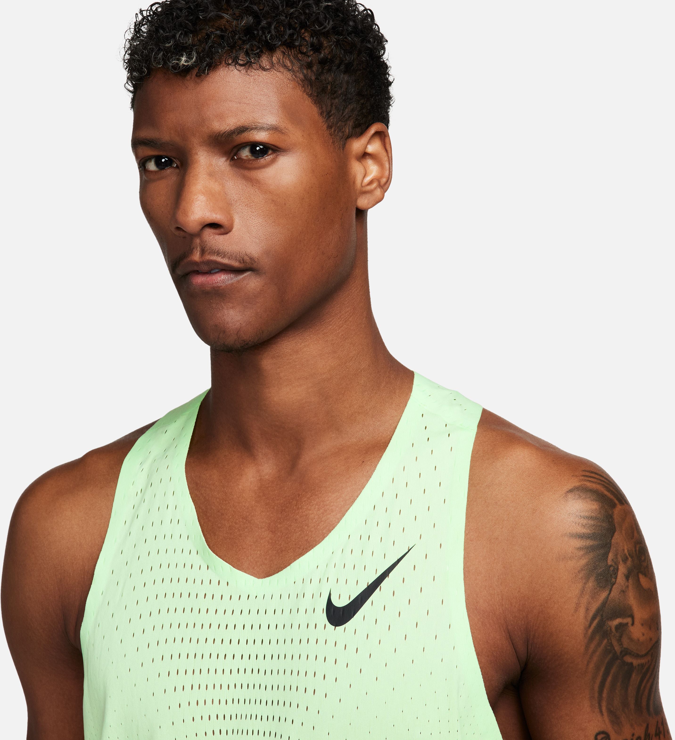 Nike AeroSwift Dri-FIT ADV hardloopsinglet voor heren Je hebt lastige overwinningen geboekt om het nu tegen de besten te kunnen opnemen. Dus laat de ultra-ventilerende feel van onze AeroSwift singlet je meenemen over de finish. Deze lichte en soepele top is ontworpen voor wedstrijden en maakt gebruik van onze meest innovatieve technologieën zodat jij je kunt focussen op je personal bests. Ga hard Nike Dri-FIT ADV technologie combineert vochtafvoerend materiaal met geavanceerde technieken en eigenschappen, zodat je droog en comfortabel blijft. Gegevens van echte hardlopers zoals jij zijn gebruikt om open gaatjes in het materiaal te plaatsen voor gerichte ventilatie waar je die het meest nodig hebt. Verbeterde pasvorm Een smallere zoom in vergelijking met eerdere AeroSwift singlets biedt extra bedekking. Gelijmde naden bij de armsgaten en kraag zorgen voor een meer aansluitend gevoel en voorkomen schuren. Innovatief en snel De AeroSwift collectie is de beste racegear van Nike. De collectie is gemaakt voor snelheid met de nieuwste innovaties, voor optimale performance en bedekking zodat je niet afgeleid raakt. De gestroomlijnde designs zijn licht en strak, zodat je je vrij kunt bewegen terwijl je er alles uithaalt. Swoosh logo's hebben een niet-reflecterende afwerking om je te beschermen tegen flitsfotografie tijdens de race.