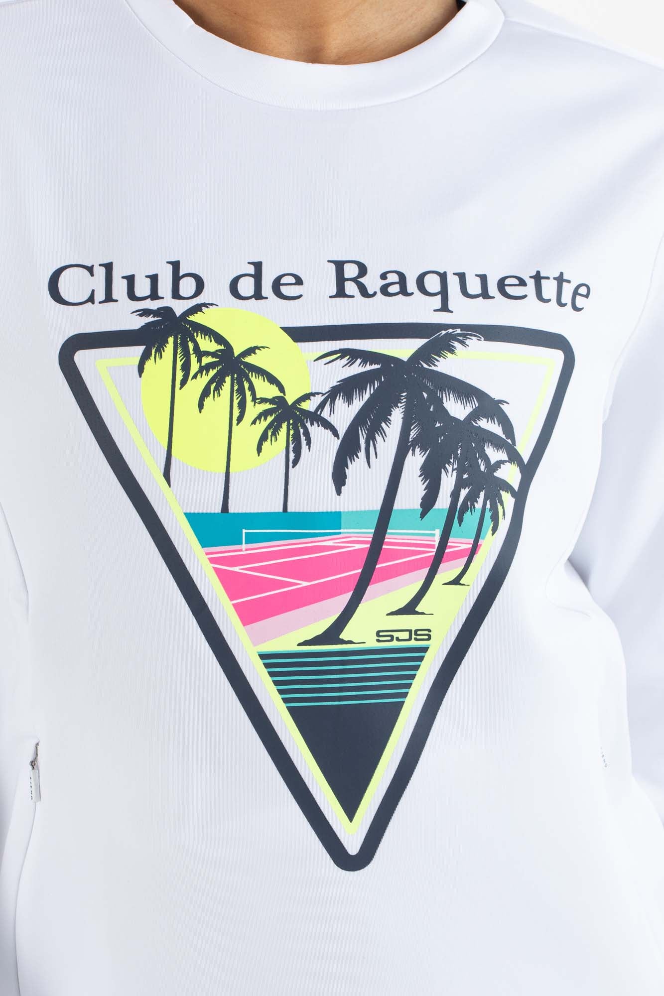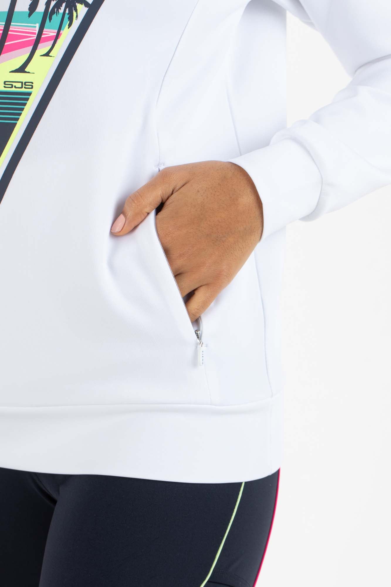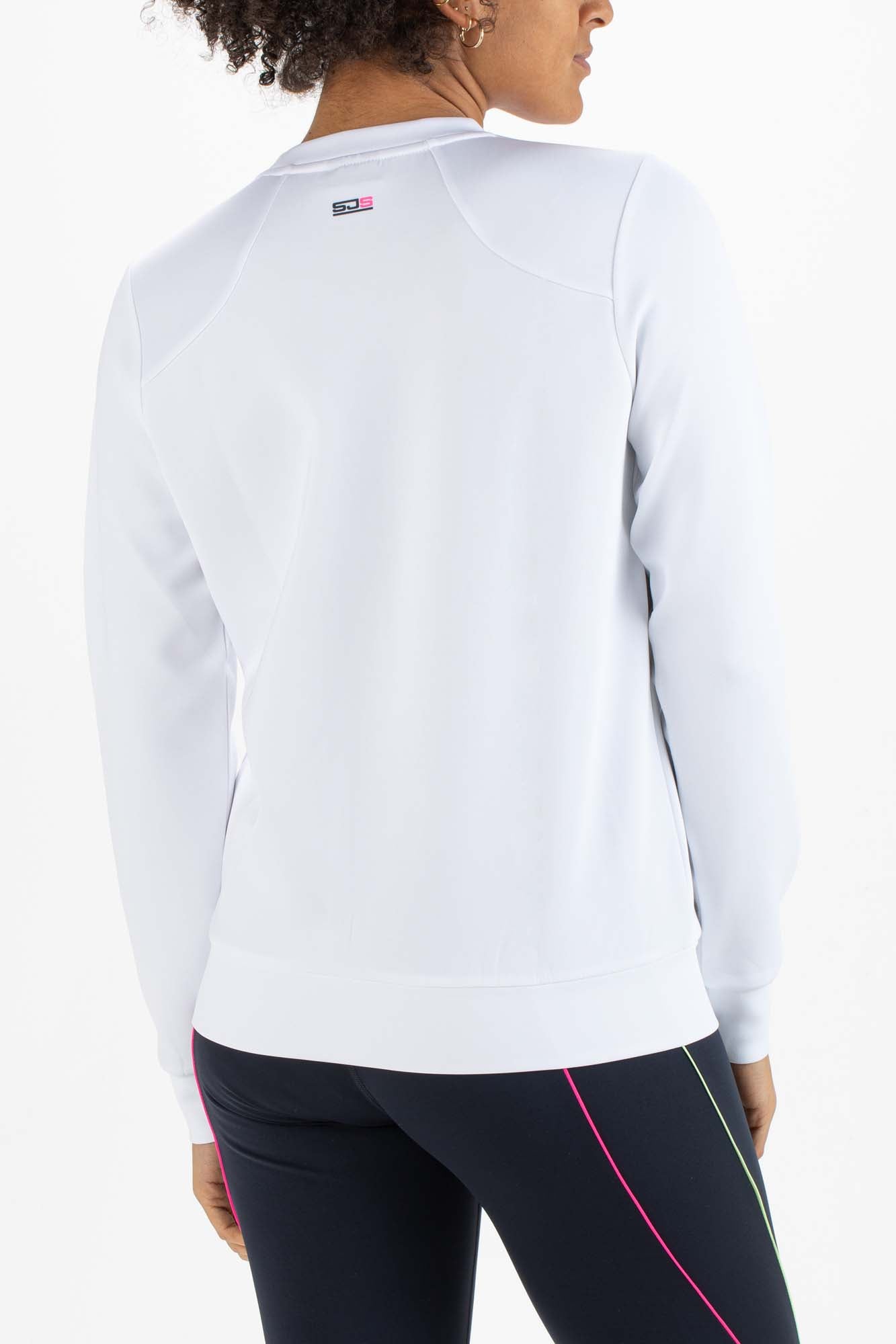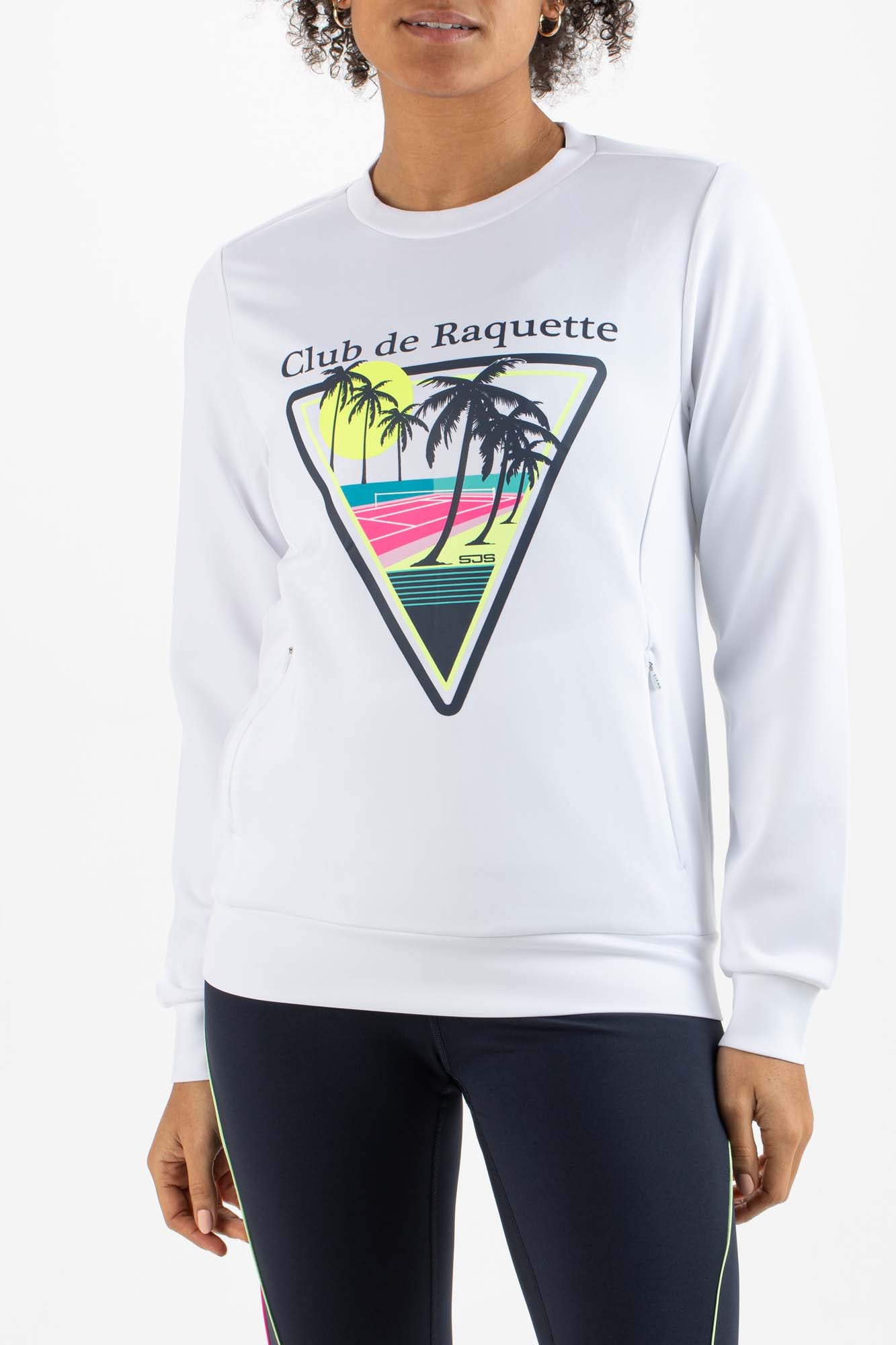 Modieus dames sweatshirt van dubbelgebreid materiaal met lange mouwen en twee steekzakken met ritssluitingen. Dit donkerblauwe shirt met trendy multi-color opdruk is perfect voor in de padelkooi of op de tennisbaan tijdens de wat koelere dagen of avonden.