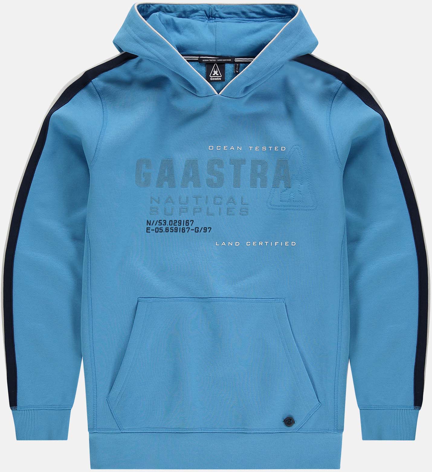 De Arc is een Fairtrade sweater met capuchon, een kangoeroezak en een merklogo op de borst met geborduurde elementen. De sweater heeft een klassiek gestreept ontwerp langs de mouwen.