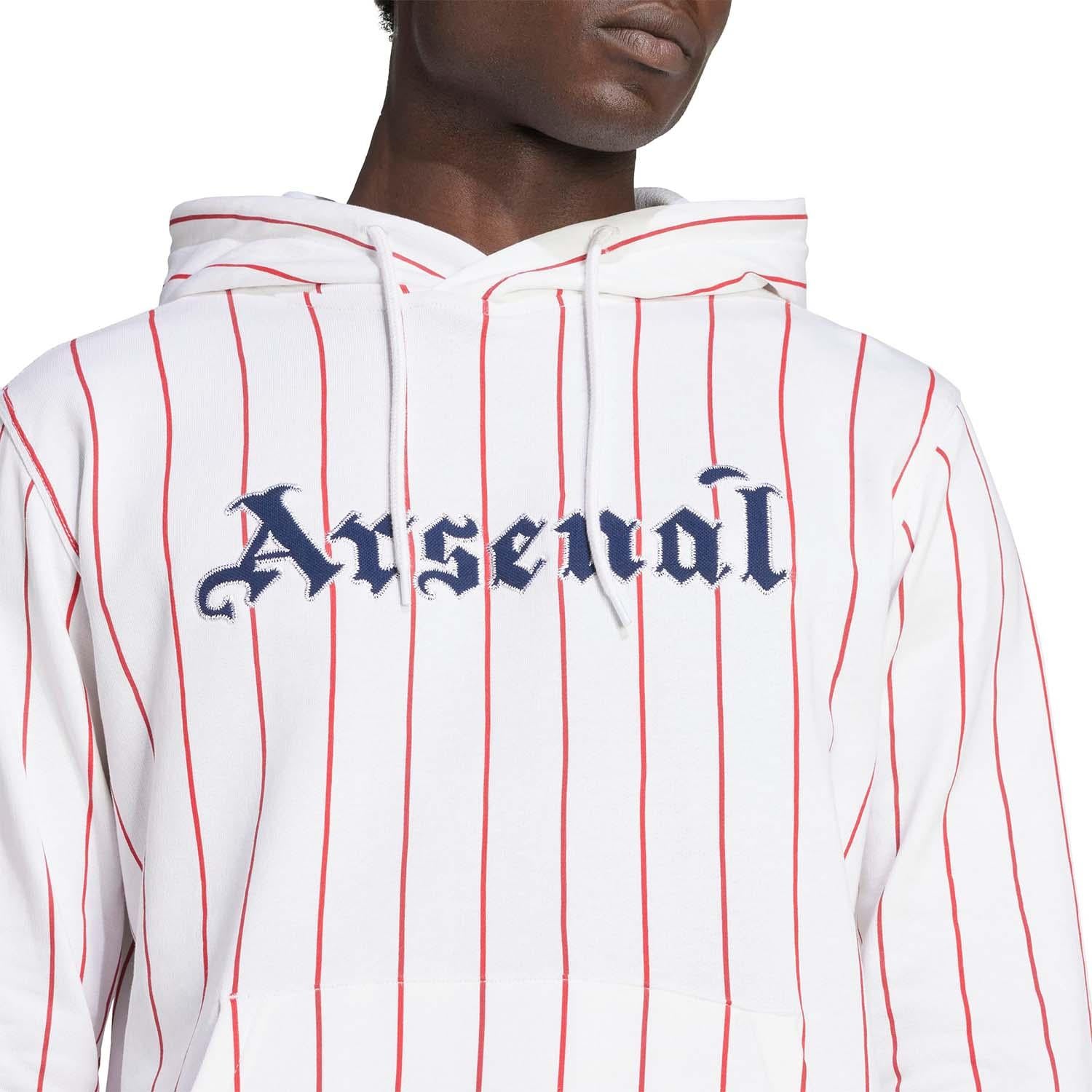 Laat je passie voor Arsenal zien in een op de VS geïnspireerde stijl. Deze adidas voetbalhoodie maakt je wedstrijdoutfit helemaal af met op baseball geïnspireerde krijtstrepen en opvallende letters die zijn geïnspireerd op een vintage clubembleem. Gemaakt van zachte French terry badstof, voor comfort tijdens het kijken naar de wedstrijd met je vrienden of lekker relaxen voor de tv.
