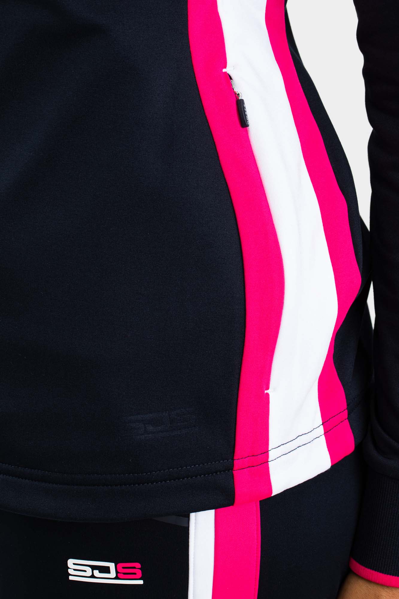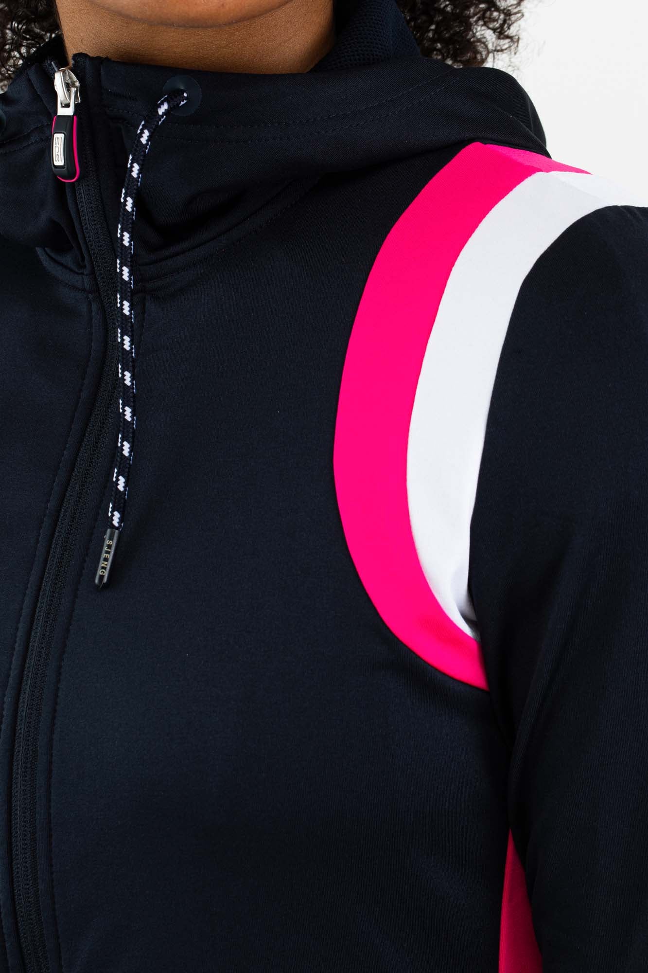 Trendy dames hoody van donkerblauw powerstretch materiaal met opvallende contrasterende strepen in wit en roze. Deze hoody heeft steekzakken met verborgen ritsen. Een fijn jack om in te trainen maar ook om gewoon in je vrije tijd te dragen.