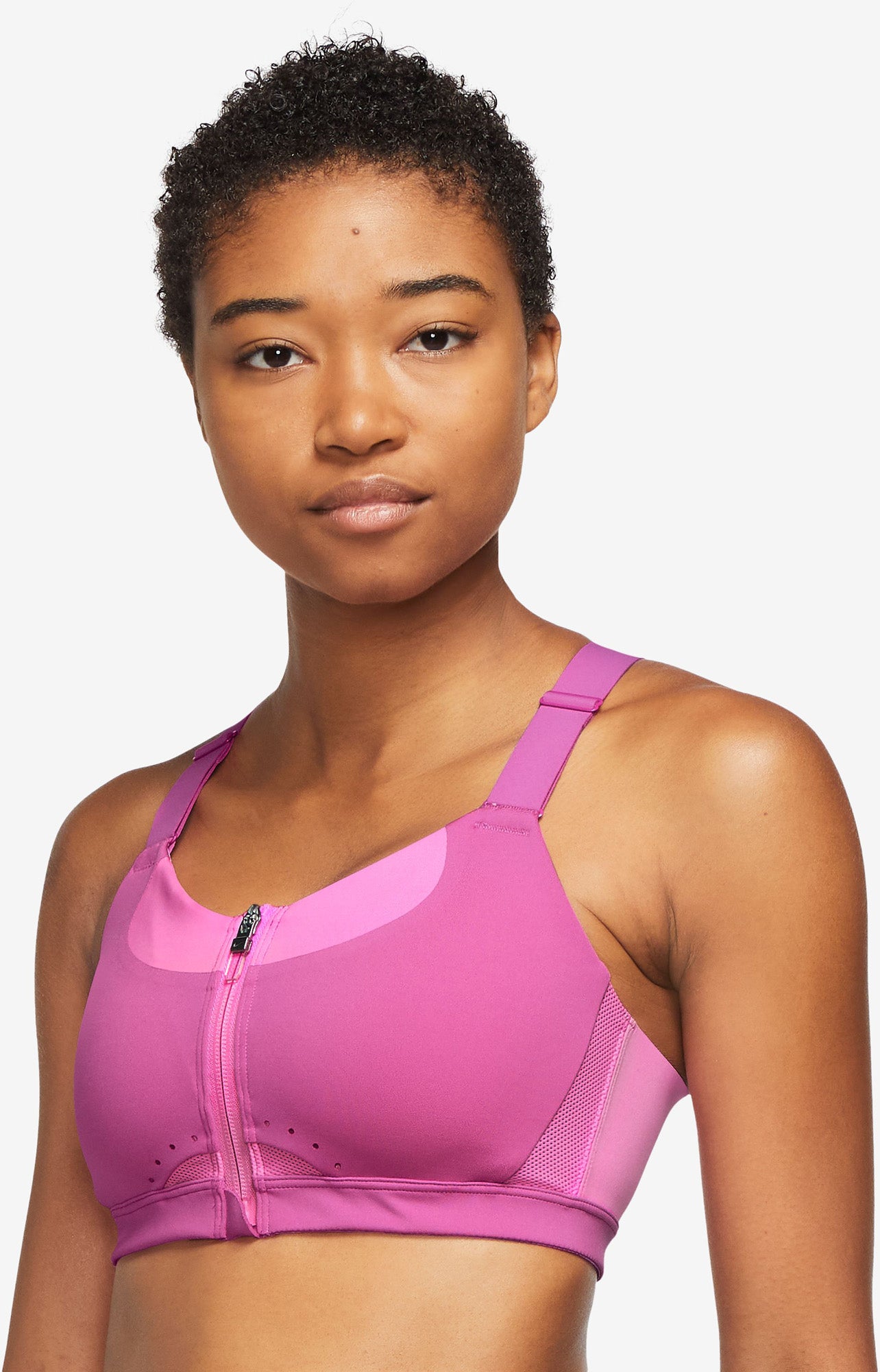 VOEL JE ZELFVERZEKERD EN ONDERSTEUND. Deze bh biedt ons hoogste niveau van ondersteuning met een compressiepasvorm die je borsten op hun plek houdt voor een stevige pasvorm. Een rits aan de voorkant en voorgevormde cups zorgen voor een fraaie vorm. Je kunt de bh aan de achterkant verstellen voor comfort en omsluiting waarin je prettig en rustig kunt ademen. Ventilatie aan de voor- en achterkant houdt je koel tijdens je work-out. Dit product is gemaakt met minstens 50% gerecyclede polyestervezels. Ondersteunende pasvorm Soepel materiaal met voorgevormde cups omsluit je met een compressiepasvorm en zorgt voor een natuurlijk profiel. Verkoelende luchtcirculatie Nike Dri-FIT technologie voert zweet weg van je huid voor snellere verdamping, zodat je droog, comfortabel en gefocust kunt blijven. Ventilerende mesh houdt je koel, ook tijdens je meest intensieve work-outs. Lekker gemakkelijk De bandjes zijn aan de voorkant te verstellen, zodat je de perfecte pasvorm kunt instellen zonder je in allerlei bochten te hoeven wringen. De semi-automatische ritsvergrendeling aan de voorkant zorgt dat de rits niet onbedoeld opengaat. De rits blijft op zijn plek wanneer je erop drukt, maar ritst gemakkelijk dicht. Er is ook een gesp aan de binnenkant voor extra veiligheid. De gespsluiting aan de achterkant maakt het aan- en uittrekken een fluitje van een cent. Dri-FIT technologie houdt je droog en comfortabel.