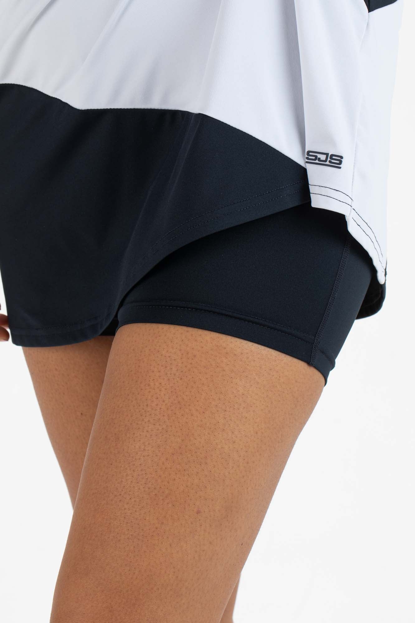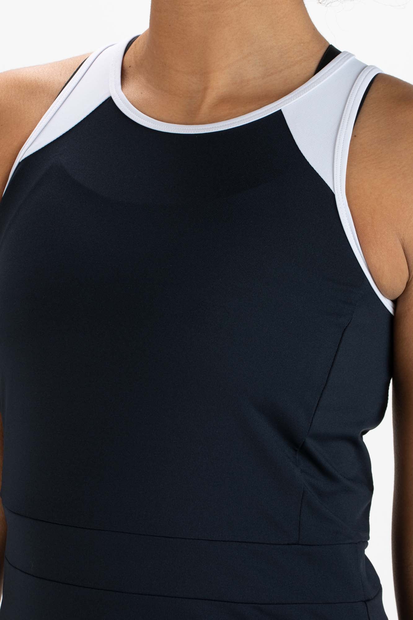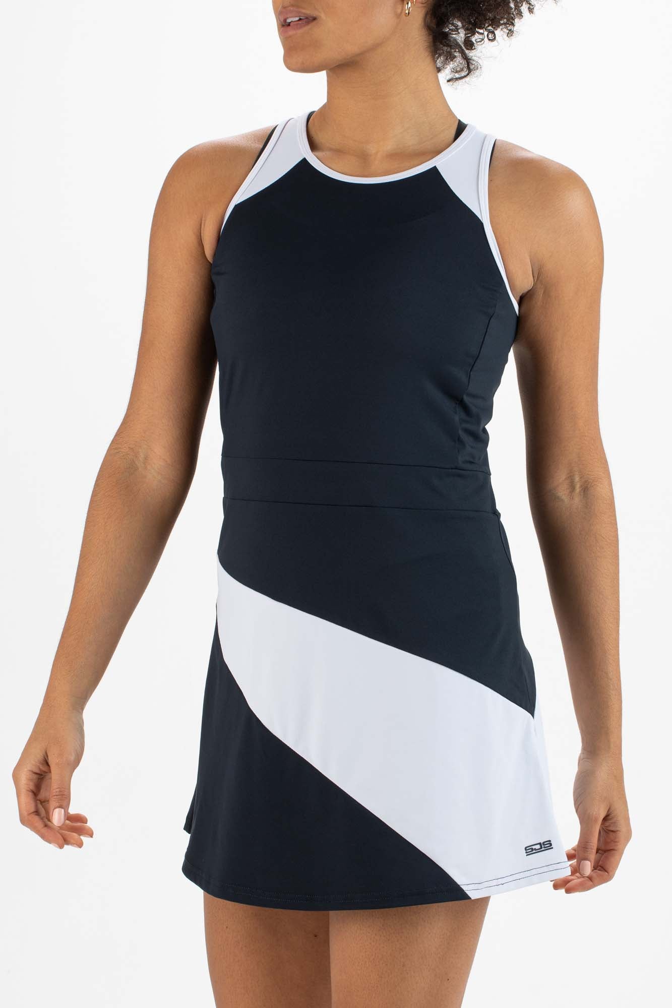 Trendy tennisjurkje, gemaakt van soepele single jersey. Dit witte jurkje valt op door de details in een contrasterende kleur, zoals de diagonale, donkerblauwe baan aan de onderkant. Het heeft op de rug gekruiste schouderbanden en een soepel binnenbroekje dat ook is gemaakt van single jersey.