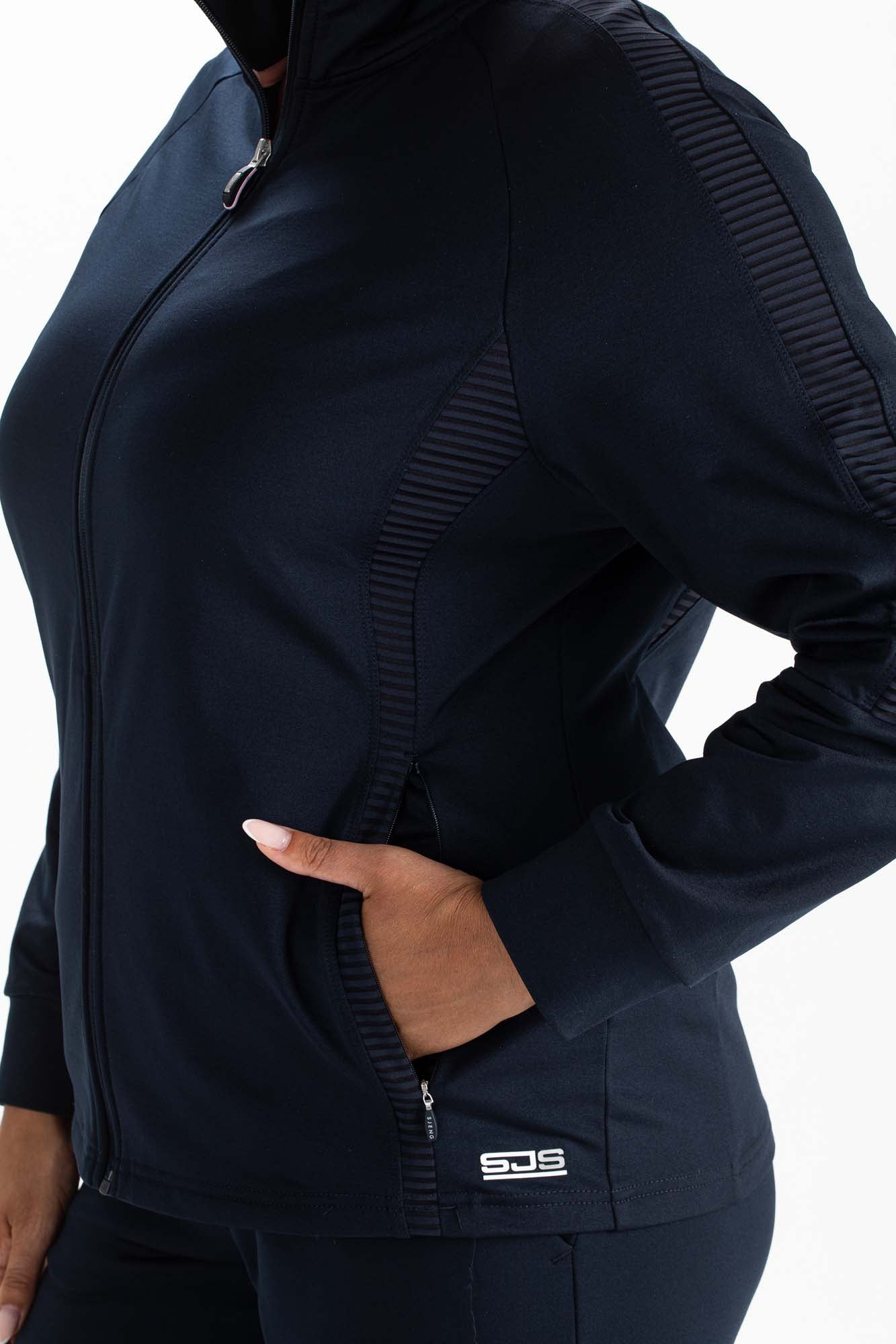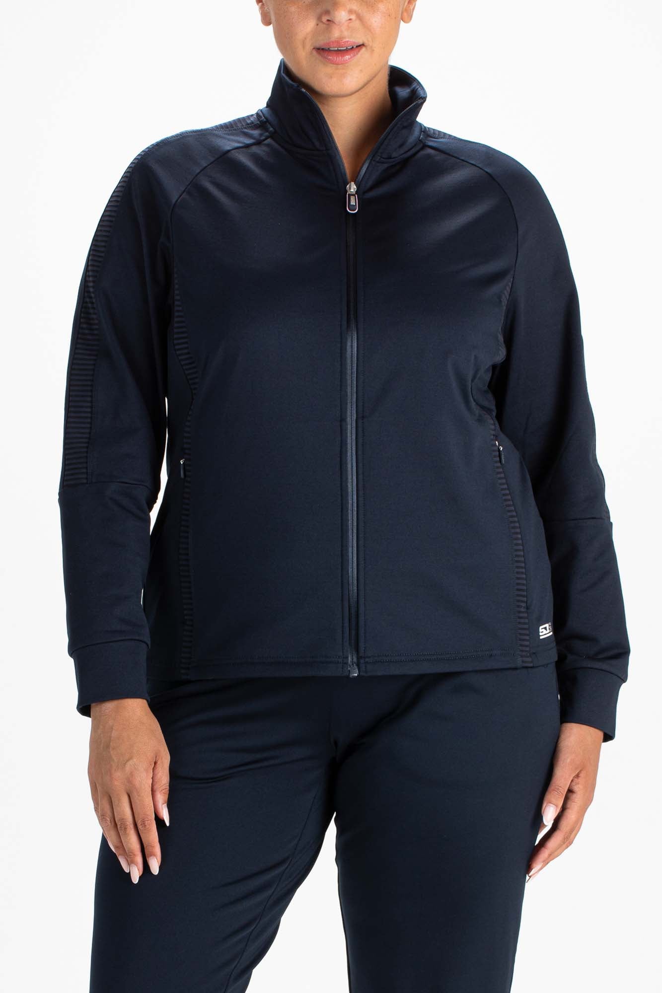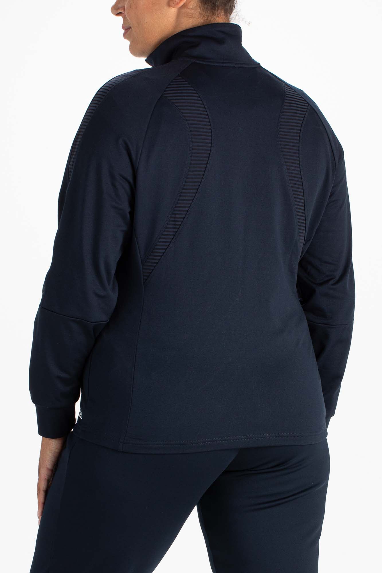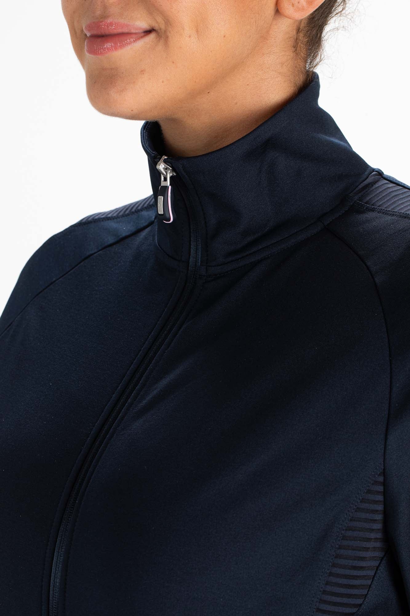 Trendy dames trainingsjack in de kleur donkerblauw. Dit jack is gemaakt van powerstretch met een geborstelde binnenkant. Langs de schouders en aan de voorkant en achterkant van de body zitten inzetten van transparant gestreepte jersey.