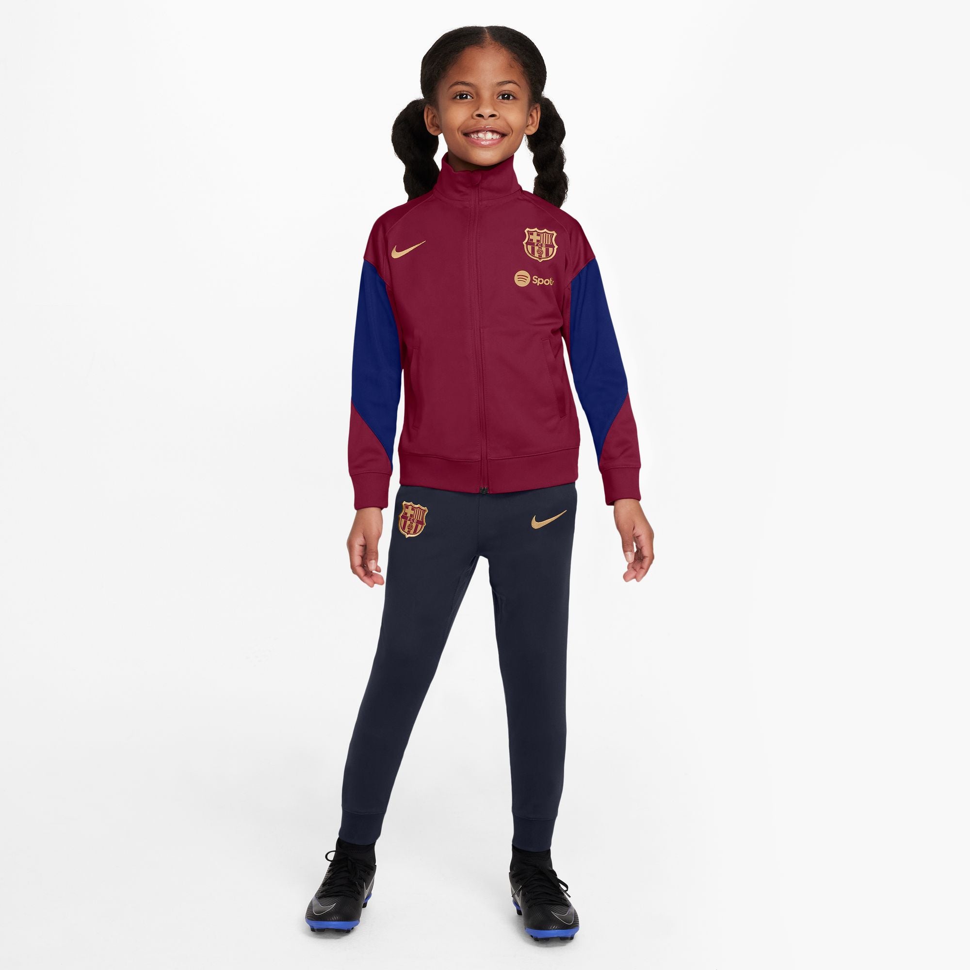 FC Barcelona Strike Little Kids' Nike Dri-FIT Soccer Knit Tracksuit With design details specifically tailored for soccer’s rising stars, a streamlined fit ensures that nothing comes between little ones and the ball. Sweat-wicking technology helps keep them cool and composed while they fine-tune your skills. Nike Dri-FIT technology helps little ones stay dry and comfortable. Lightweight knit fabric has a soft, smooth feel.
