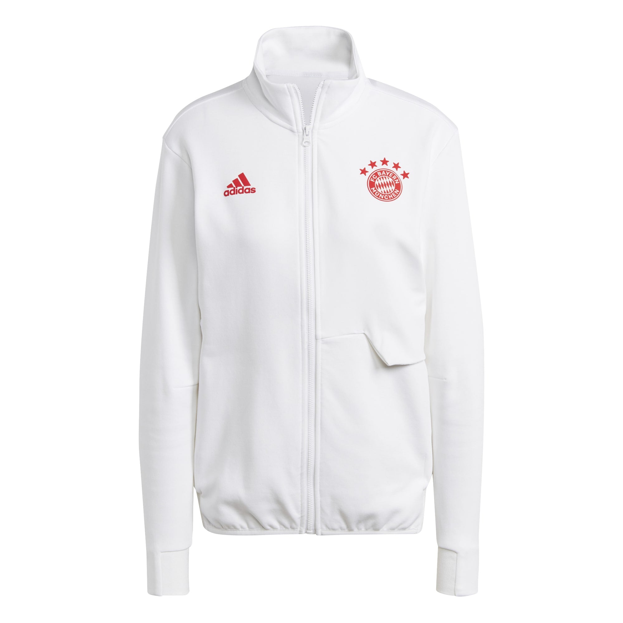 Een jack dat rijk is aan FC Bayern München DNA. Dit FC Bayern München Anthem jack straalt met de spirit van het legendarische Duitse voetbalelftal. Het leent het wit van het thuisshirt van de club, aangevuld met iconische details die het team een uniforme look geven in de line-up.