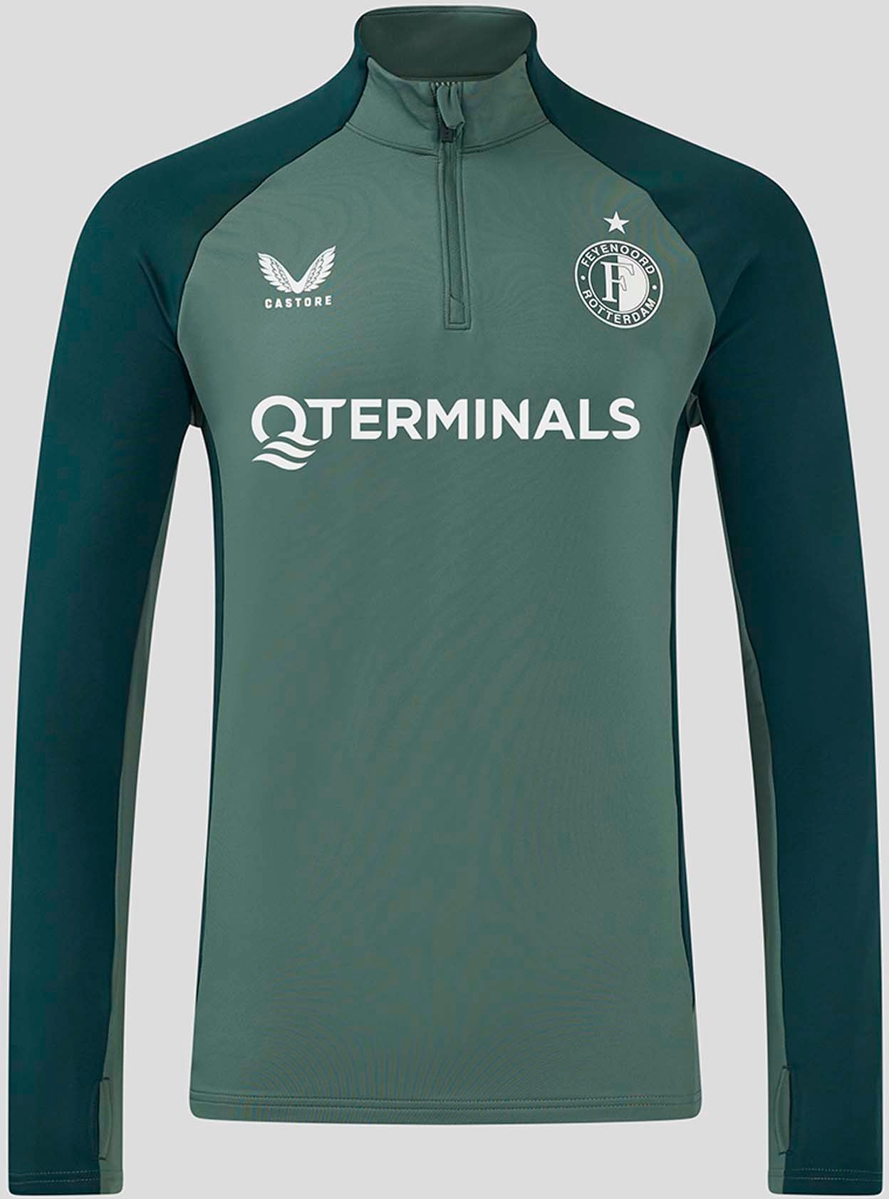 De Feyenoord Pro Speler Kwartrits Trainingstop is voor zij die elke training progressie willen maken! De raglanmouwen bieden optimale bewegingsvrijheid, terwijl de duimgaten extra comfort bieden. De opstaande kraag, kwartritssluiting en verlengde zoom houden je beschermd en warm. De kleurencombinatie van Dark Forest en Ponderosa Pine geeft een moderne en futuristische uitstraling. Met het clublogo trots op je linkerborst laat je zien waar je hart ligt!