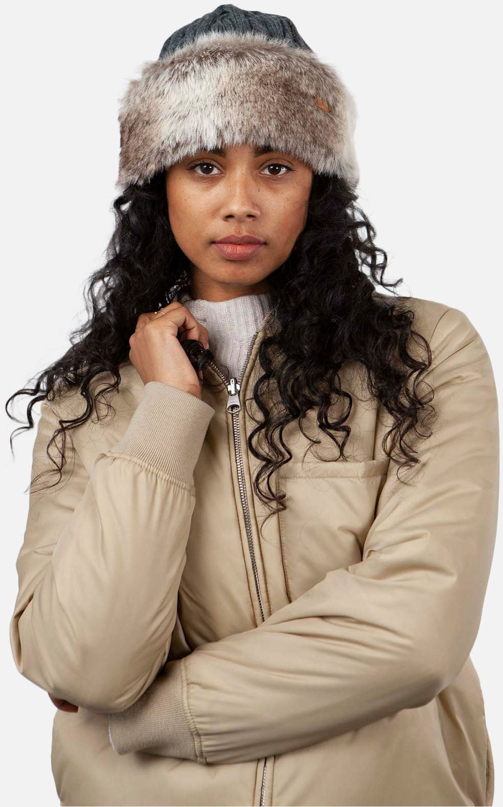 De Fur Cable Bandhat is een muts met een zachte, fleece gevoerde hoofdband, gemaakt van imitatiebont met een kabelgebreide top. Te combineren met de Mickelle col.