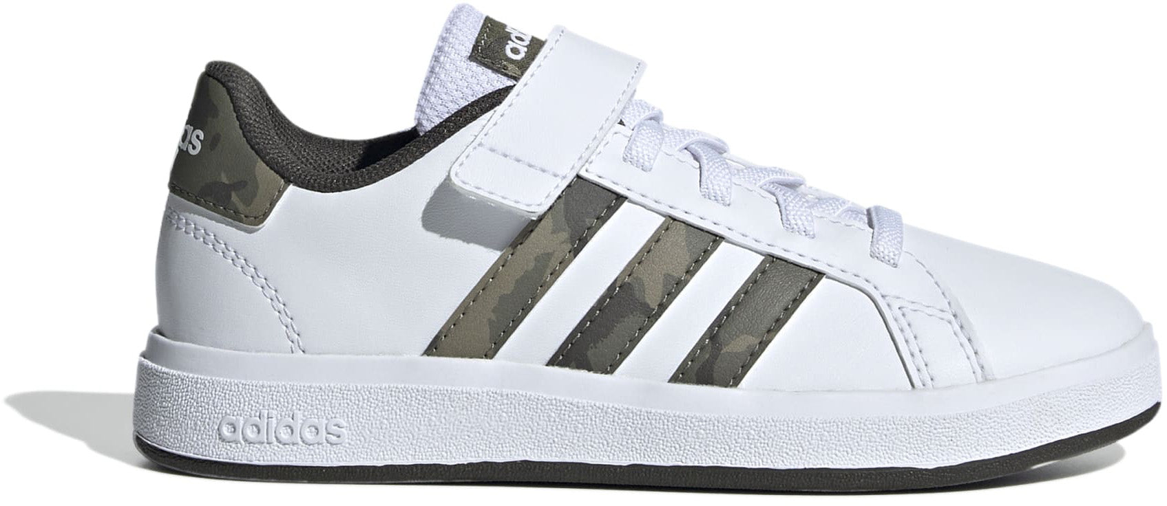 Het avontuur begint hier. Deze adidas schoen spoort kids aan tot actie met een nauwsluitende pasvorm en een stroeve zool voor spelen op volle snelheid. Dankzij het klittenband kunnen kids zelf de juiste pasvorm bepalen. Het bovenwerk van synthetisch leer is glad en robuust, met een coole camo-print op de 3-Stripes en het hielstuk voor stijl onder de radar. Of ze nu tikkertje spelen of hun moves oefenen, deze Grand Court 2.0 schoenen houden kids comfortabel en in beweging.