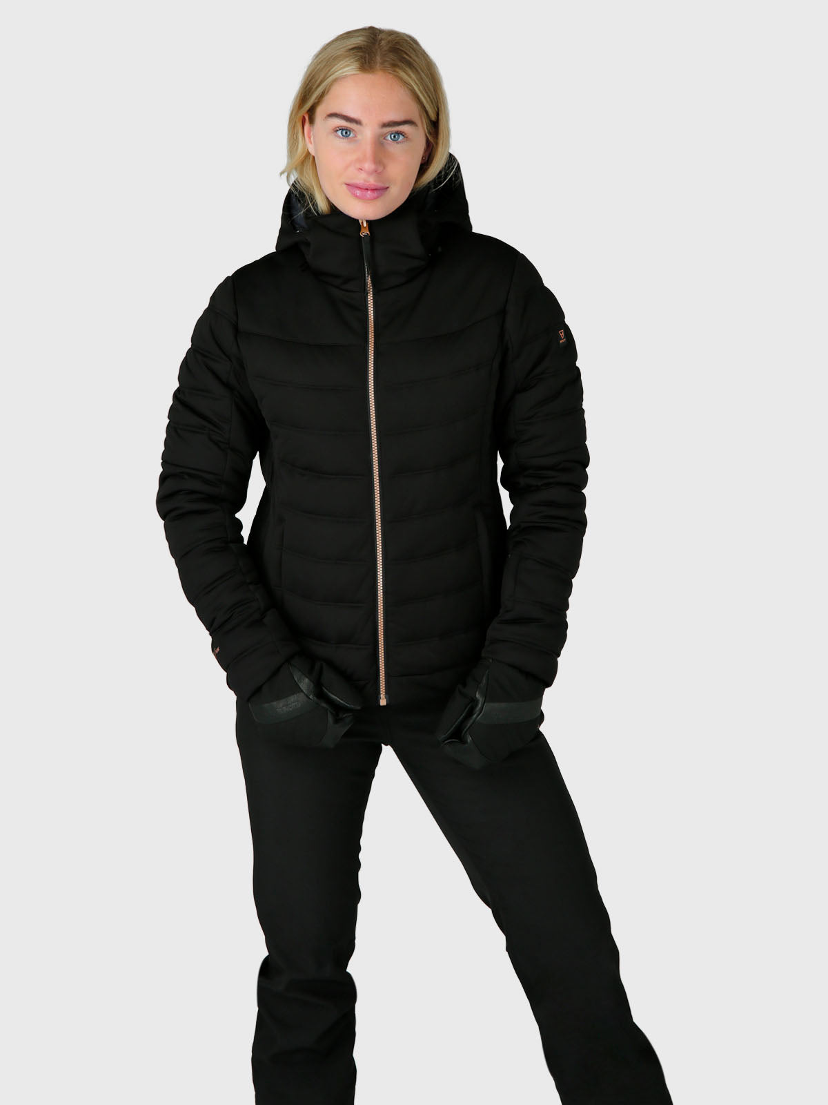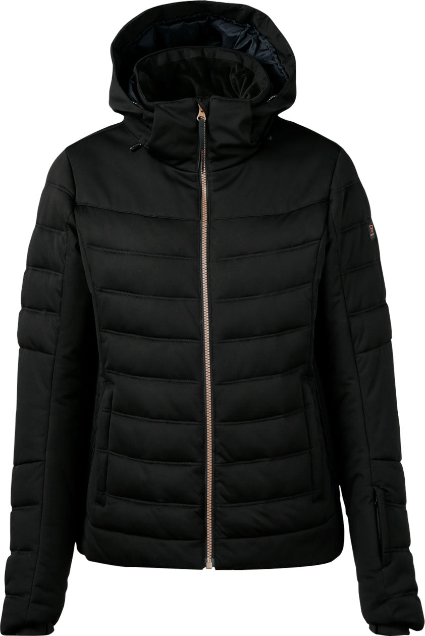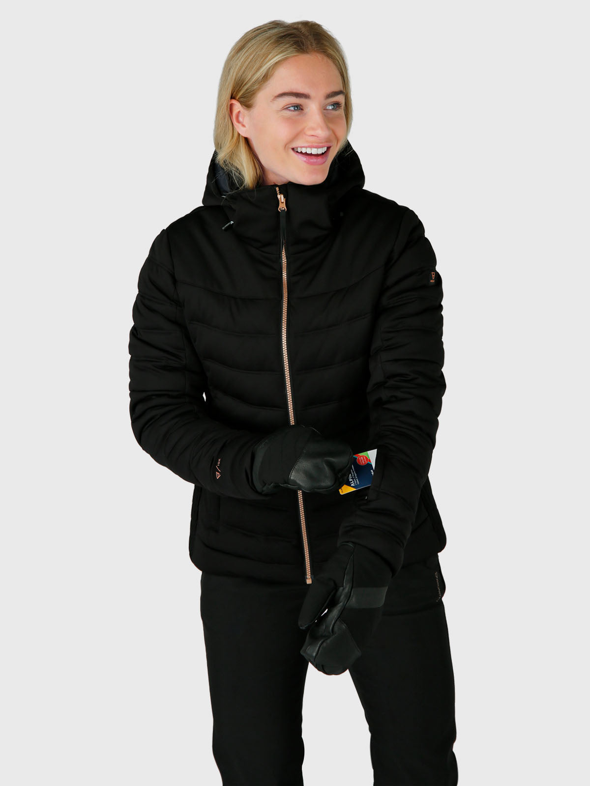 De gewatteerde Grivola snowjacket heeft naast alle coole ski features extra mooie details: aan de zijkant is de jas op een bijzondere manier gesmokt en de koperen rits heeft vierkante bloktandjes.