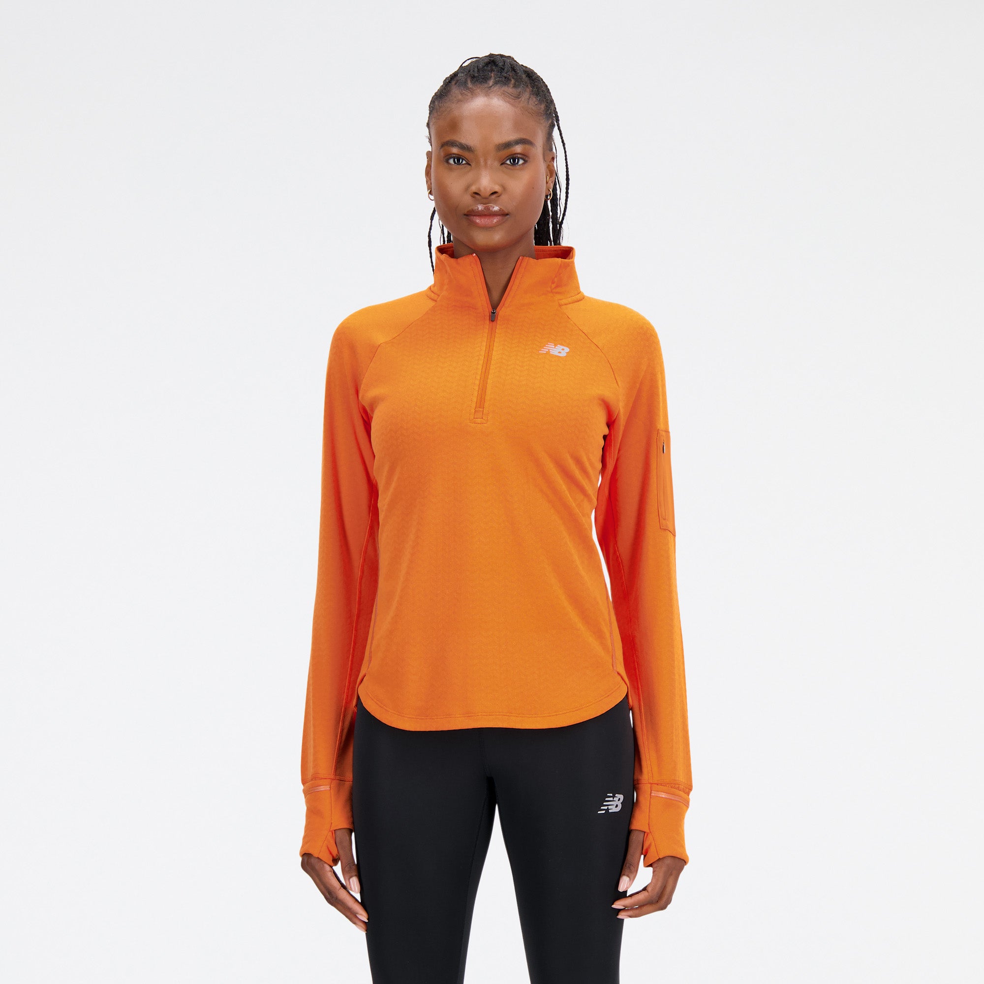 Gemaakt voor de hardloper die zich door het koude weer niet laat weerhouden om naar buiten te gaan om te rennen. NB Warmtetechnologie met ons nieuwe warmteroosterpatroon, nu groen blad duurzaam. Pullover met 1/2 rits met gebruik van Heat Grid-materiaal voor warmte maar ademend vermogen. zak met ritssluiting op de mouw, rol om reflecterende duimgaten te onthullen.