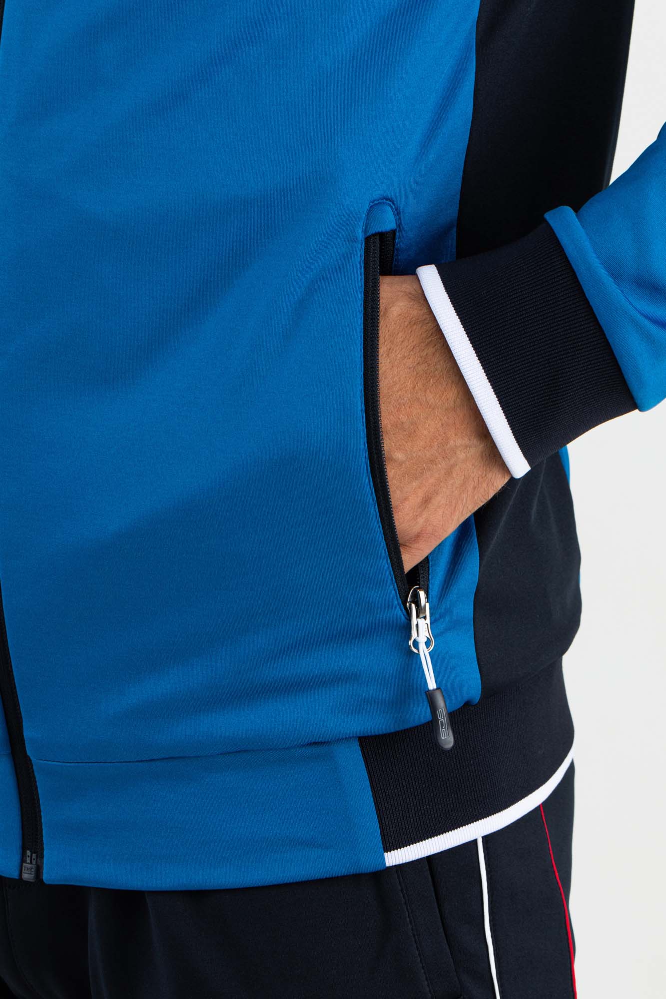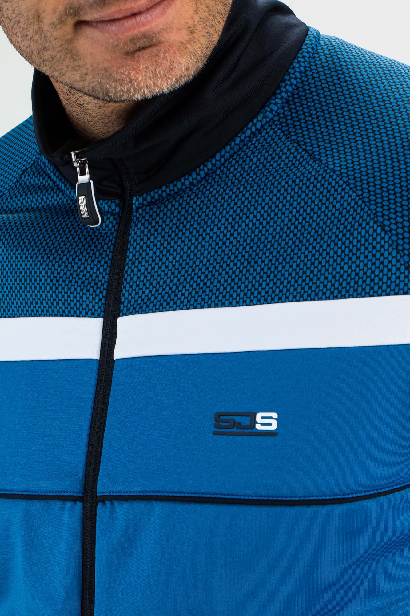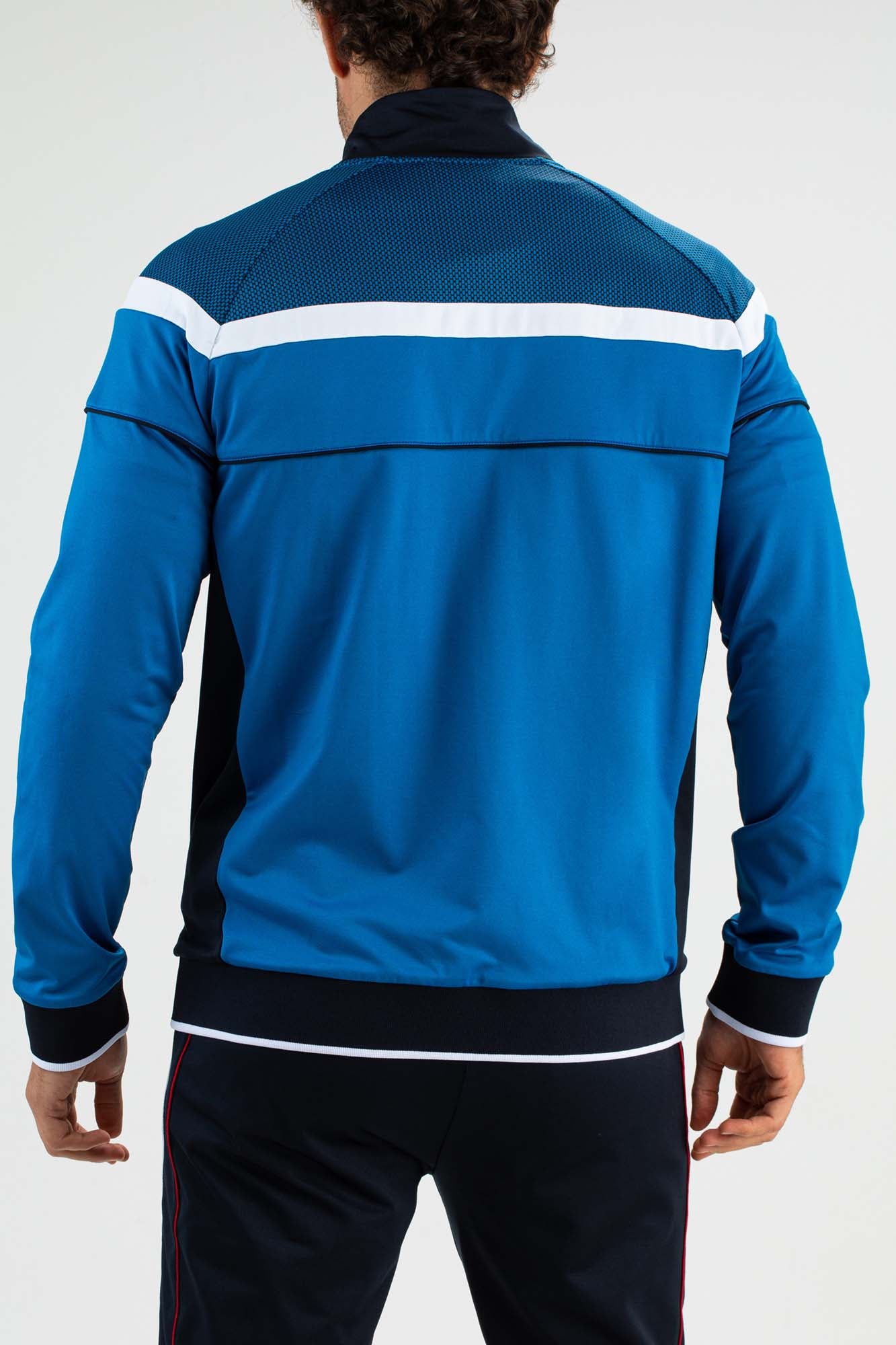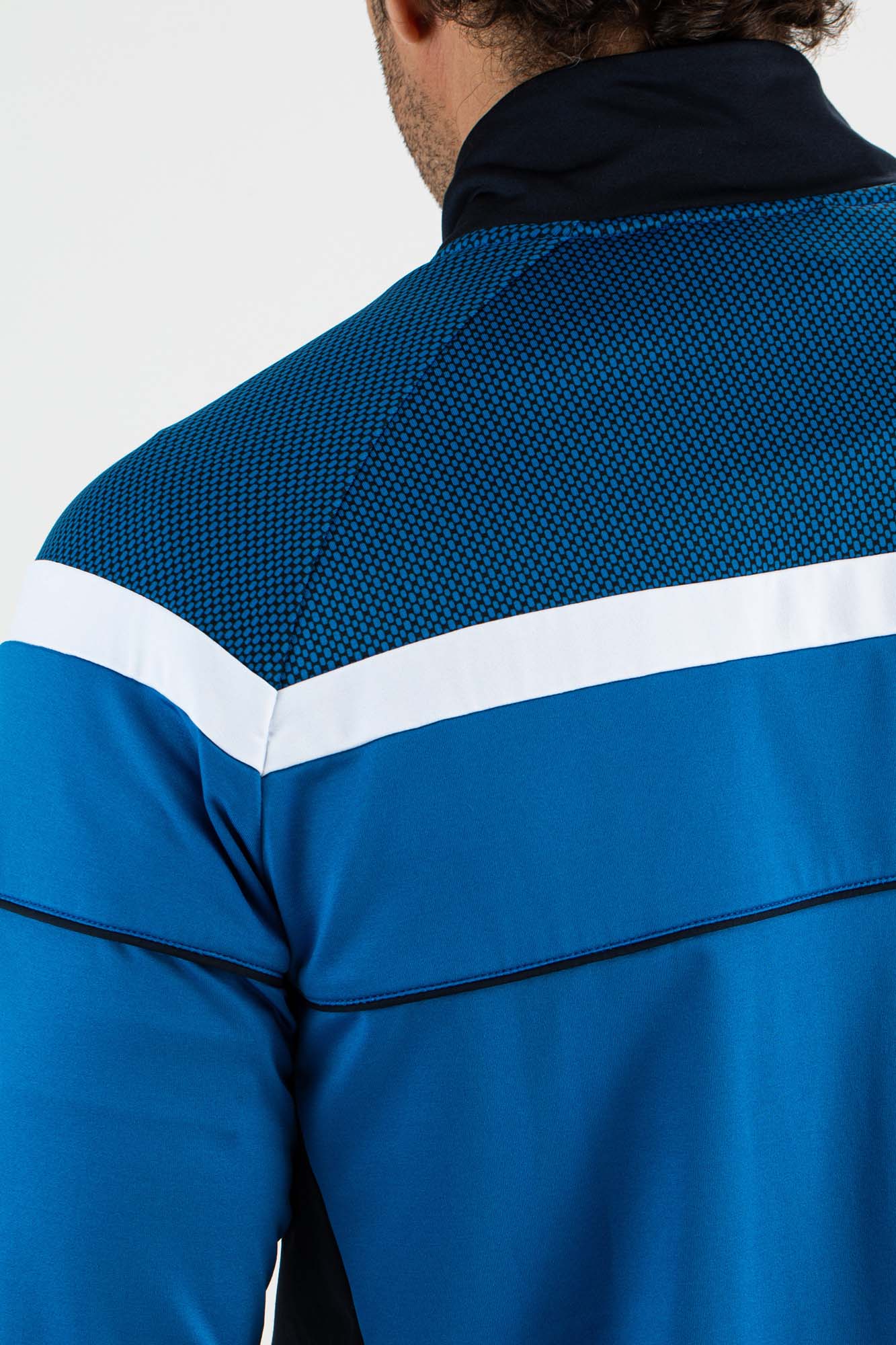 Stijlvol heren trainingsjack in twee kleuren blauw met opvallende witte details. Dit trainingsjack is gemaakt van soepel powerstretch materiaal en de donkerblauwe inzetten bovenaan bij de schouders hebben een op mesh stof lijkende print. Bovenaan loopt over de borst, mouwen en rug een verticale witte bies.