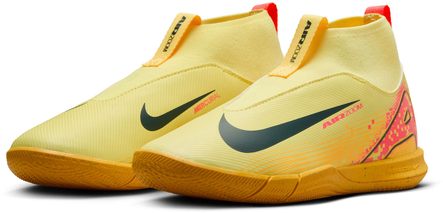 Kylian Mbappe Nike Jr. Mercurial Superfly 10 Academy "Kylian Mbappé" MG hoge voetbalschoenen voor kinderen Wil je je snelheid naar een hoger niveau tillen? We hebben deze Academy-schoenplaatjes gemaakt met een verbeterde Air Zoom-eenheid in de hiel. Het geeft jou, en Kylian Mbappé, het voortstuwende gevoel dat nodig is om door de achterlijn te breken. Het resultaat is de meest responsieve Mercurial die we ooit hebben gemaakt, zodat je je snelheid kunt laten zien en de bal achterin het net kunt slaan. Versterkte aanraking Het bovenwerk is gemaakt van NikeSkin met ingebedde chevrons, die zorgen voor balcontrole en je echt het gevoel geven van voetbal op blote voeten. Snelle tractie Het golfachtige tractiepatroon is een reeks trapsgewijze noppen, zodat deze een groter oppervlak van de Air Zoom-eenheid aangrijpt en tegelijkertijd de juiste hoeveelheid grip biedt. Nauwsluitende pasvorm Treklipjes en een riem gecombineerd voor een ontwerp dat de noodzaak van veters elimineert en je helpt snel op het veld te komen. We hebben het stretchgaas van de vorige generatie geüpgraded naar een aanpasbaar breisel dat flexibiliteit biedt, ondersteuning biedt en je dichter bij de bal brengt. Een Dynamic Fit-kraag omhult je enkel met zacht, rekbaar materiaal voor een stevig gevoel.