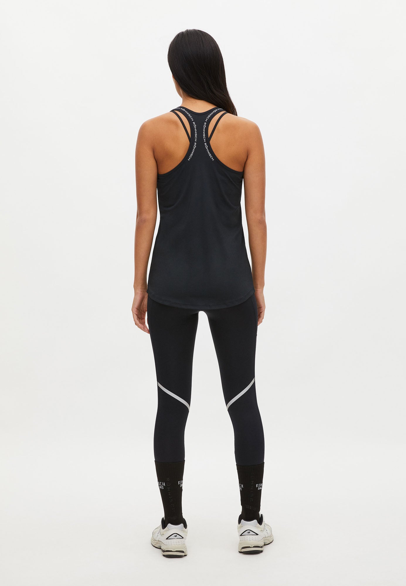 Nauwsluitend model met racerback en logoprint langs de schouders.