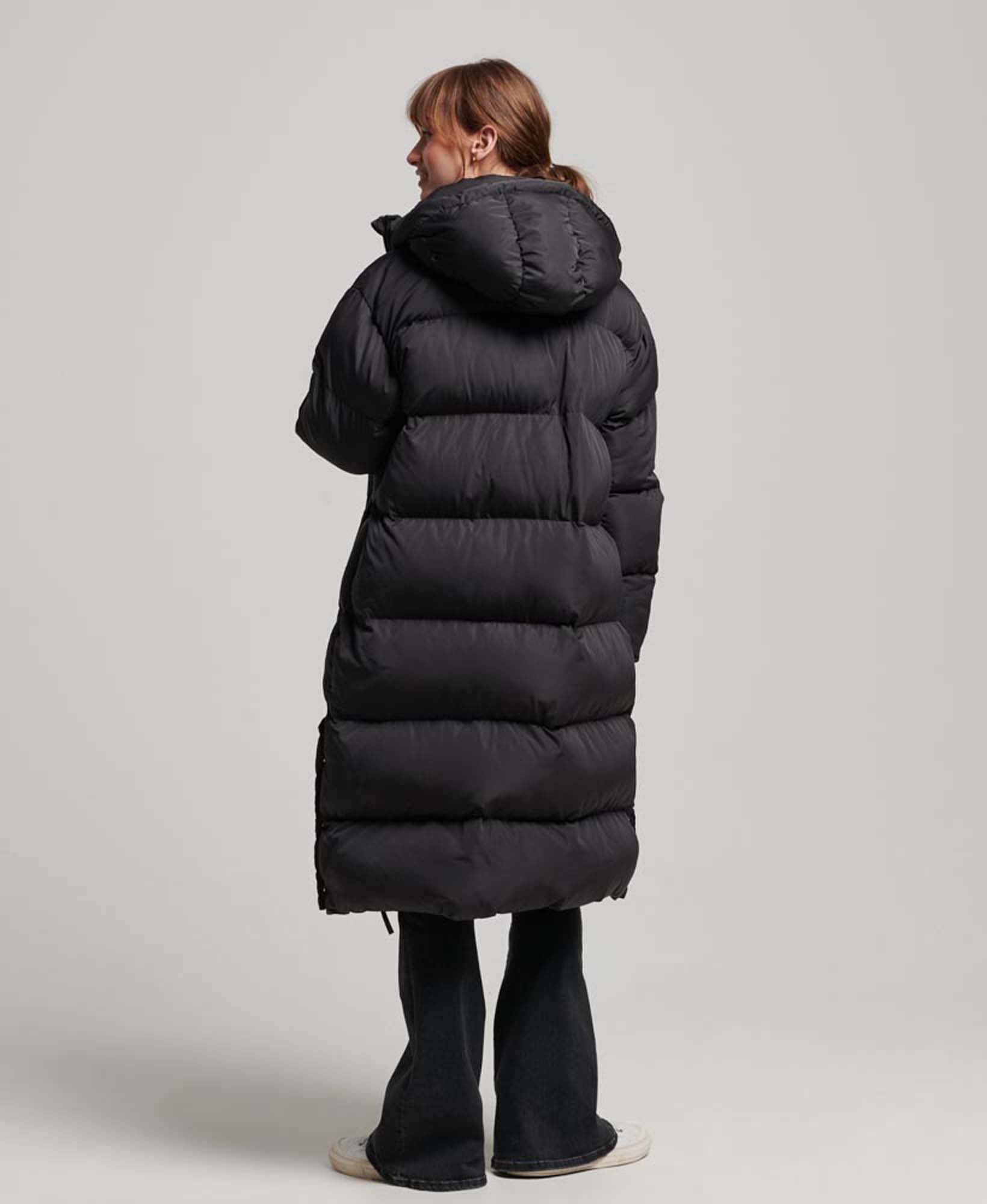 De Superdry Longline Hooded Puffer Winterjas voor dames is een lange, gewatteerde jas met een capuchon en drukknopen aan de onderkant.