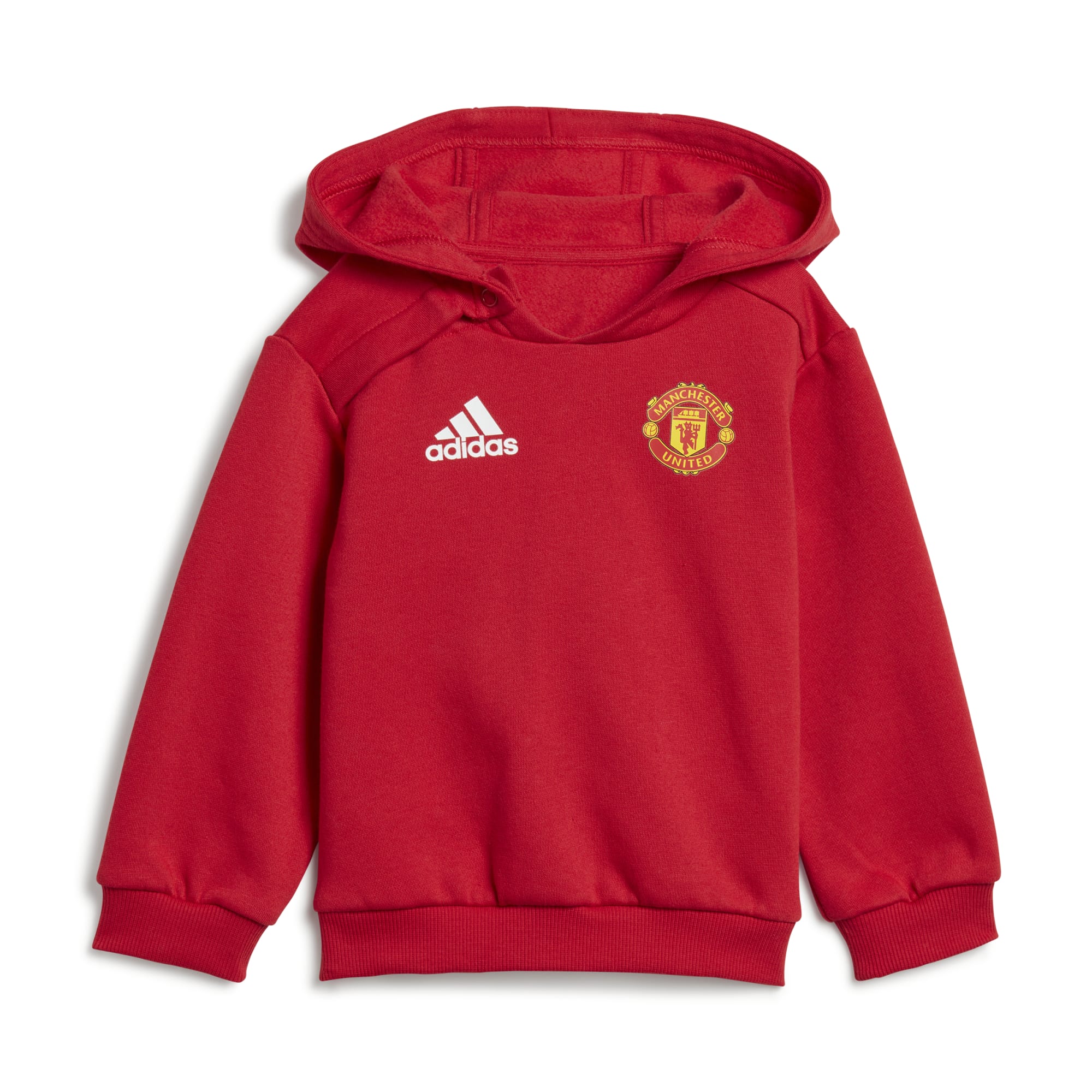 Kleed je jongste Manchester United supporter in de kleuren van je favoriete voetbalclub met dit adidas joggingpak voor peuters. De set bestaat uit een hoodie en broek die zijn gemaakt van zachte fleece om je kleintje de hele dag behaaglijk te houden. Dat almachtige embleem wakkert meteen het voetbalenthousiasme aan.