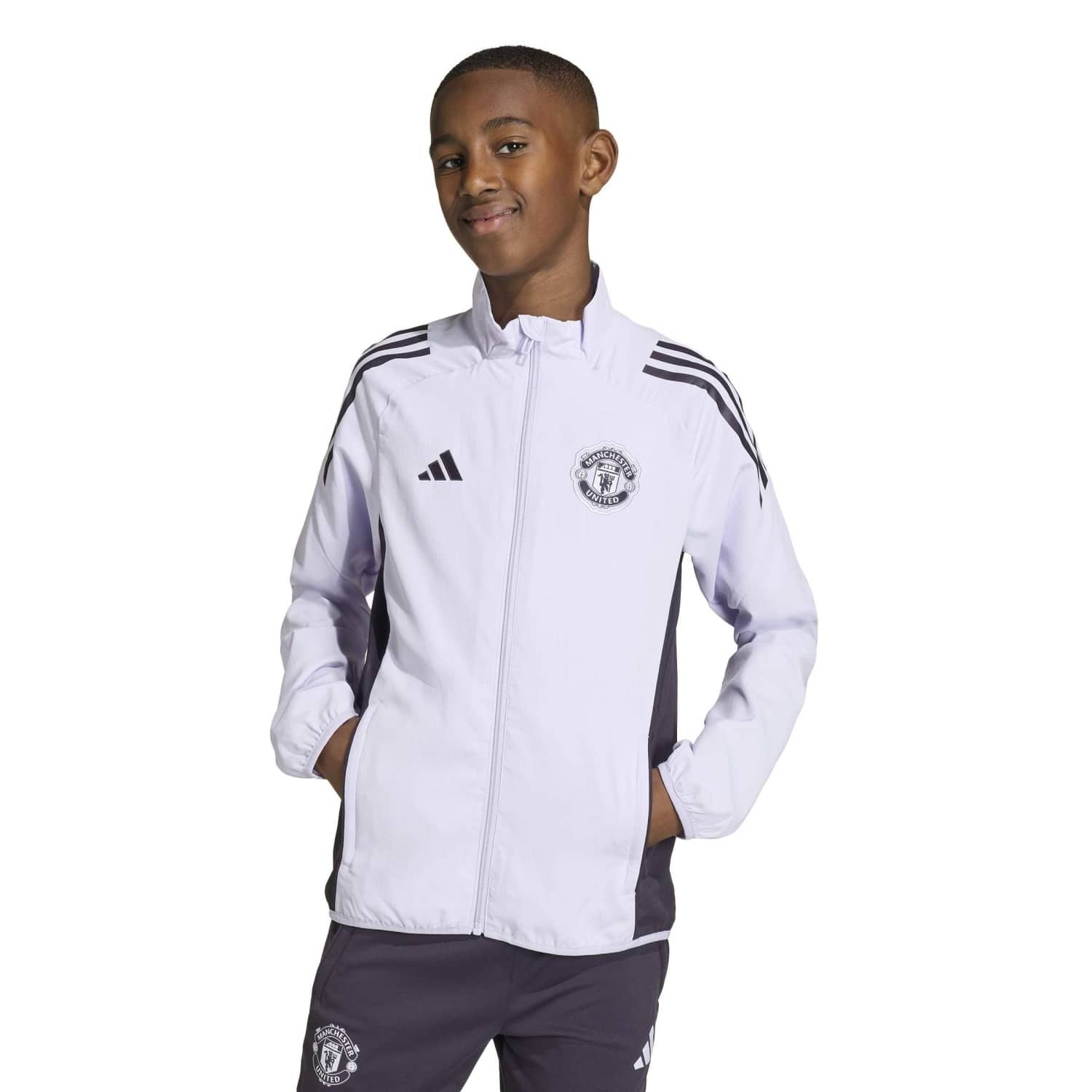 Focus op je voetbalfandom in een junior versie van het adidas jack dat de spelers van Manchester United dragen als ze de media te woord staan. De gladde geweven stof is gevoerd met zacht mesh voor een comfortabel gevoel. Een geweven embleem, dat scherp afsteekt tegen het paars van het uittenue, en heeft het laatste woord terwijl jij je club vertegenwoordigt.
