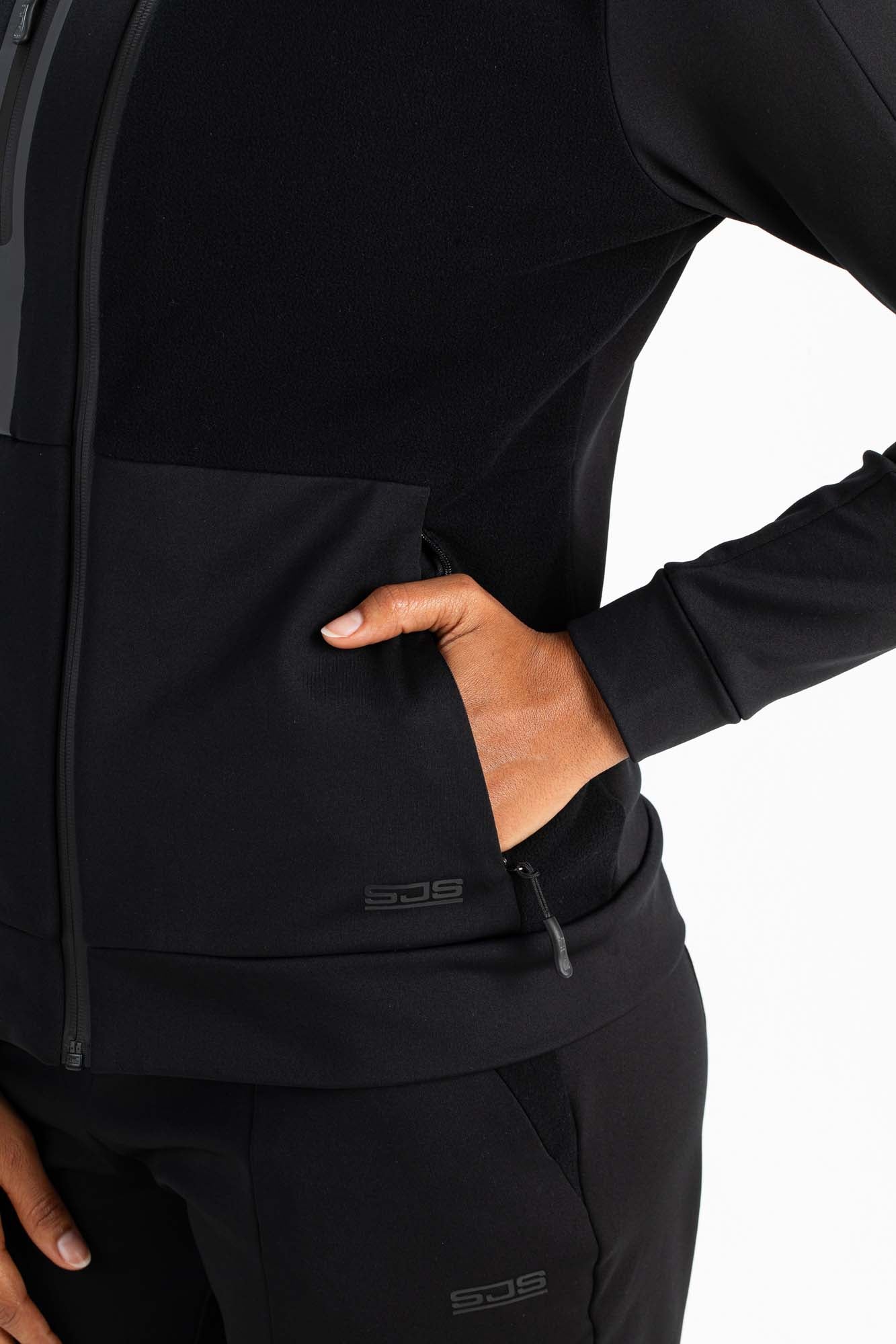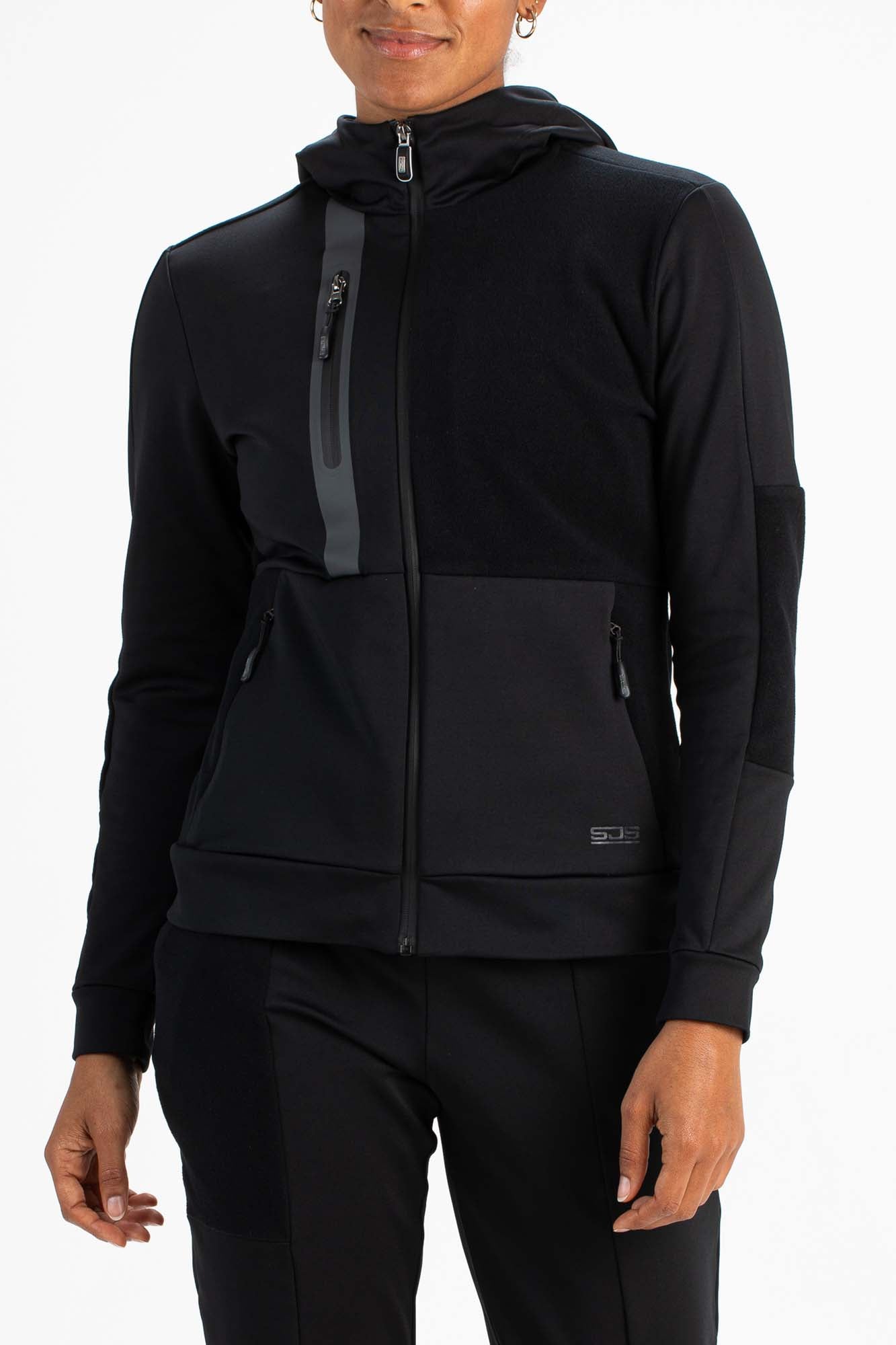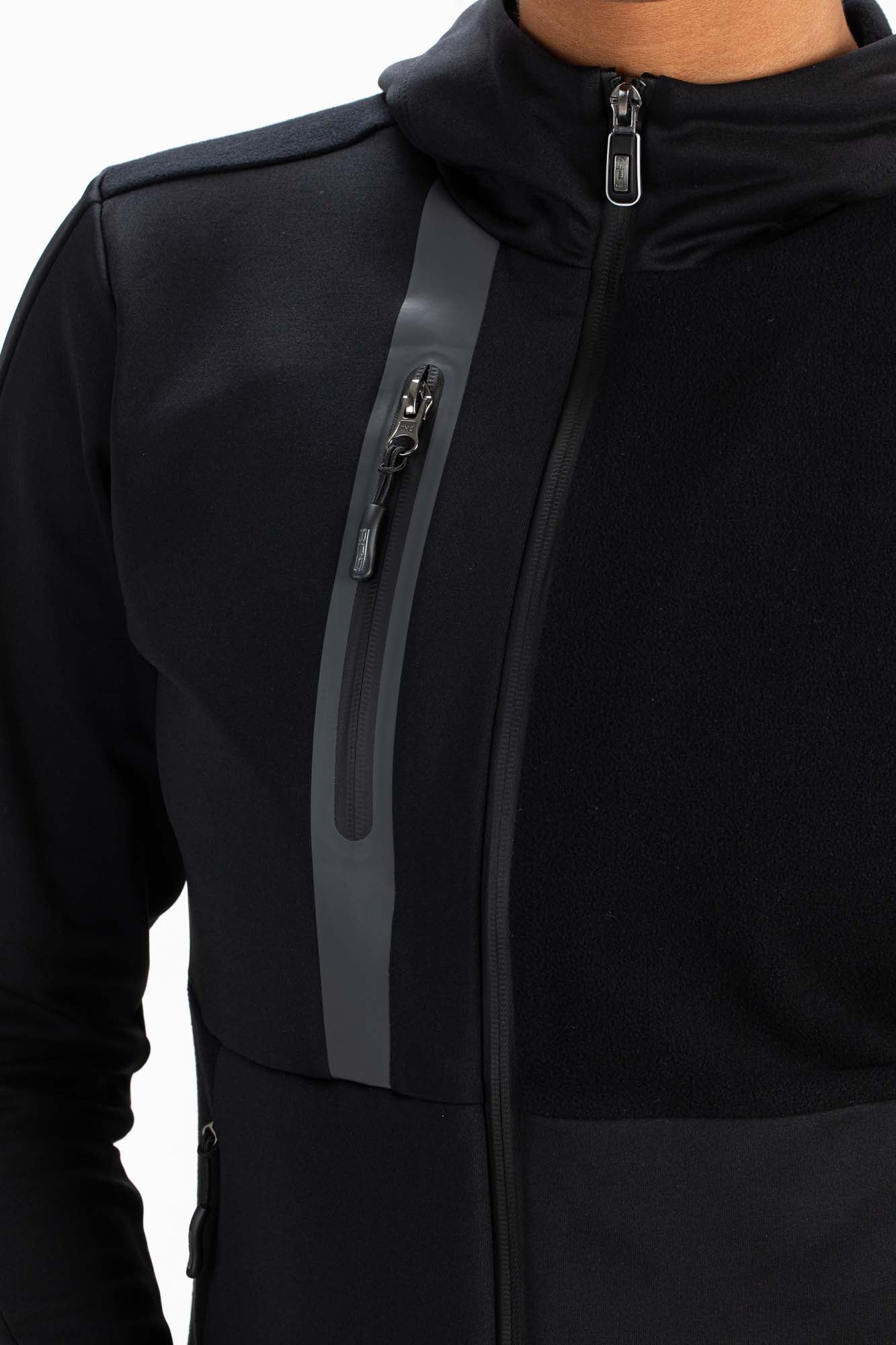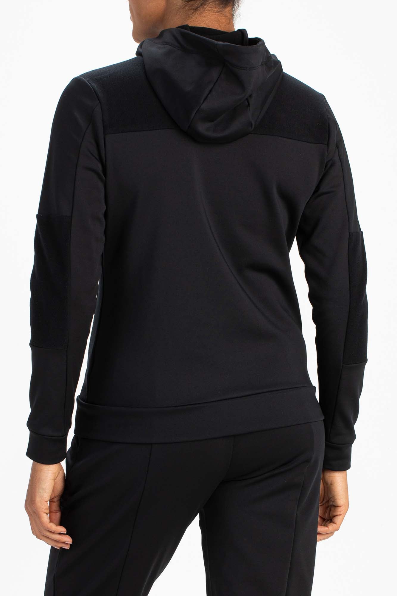 Zwart hooded trainingsjack voor dames. Dit trendy multisportjack is gemaakt van powerstretch materiaal met een geborstelde binnenkant. Opvallend aan deze hoody is dat voor sommige delen de stof omgedraaid gebruikt is. Op de borst zit een gesealde zak met rits en ook heeft het jack steekzakken met verborgen ritsen.