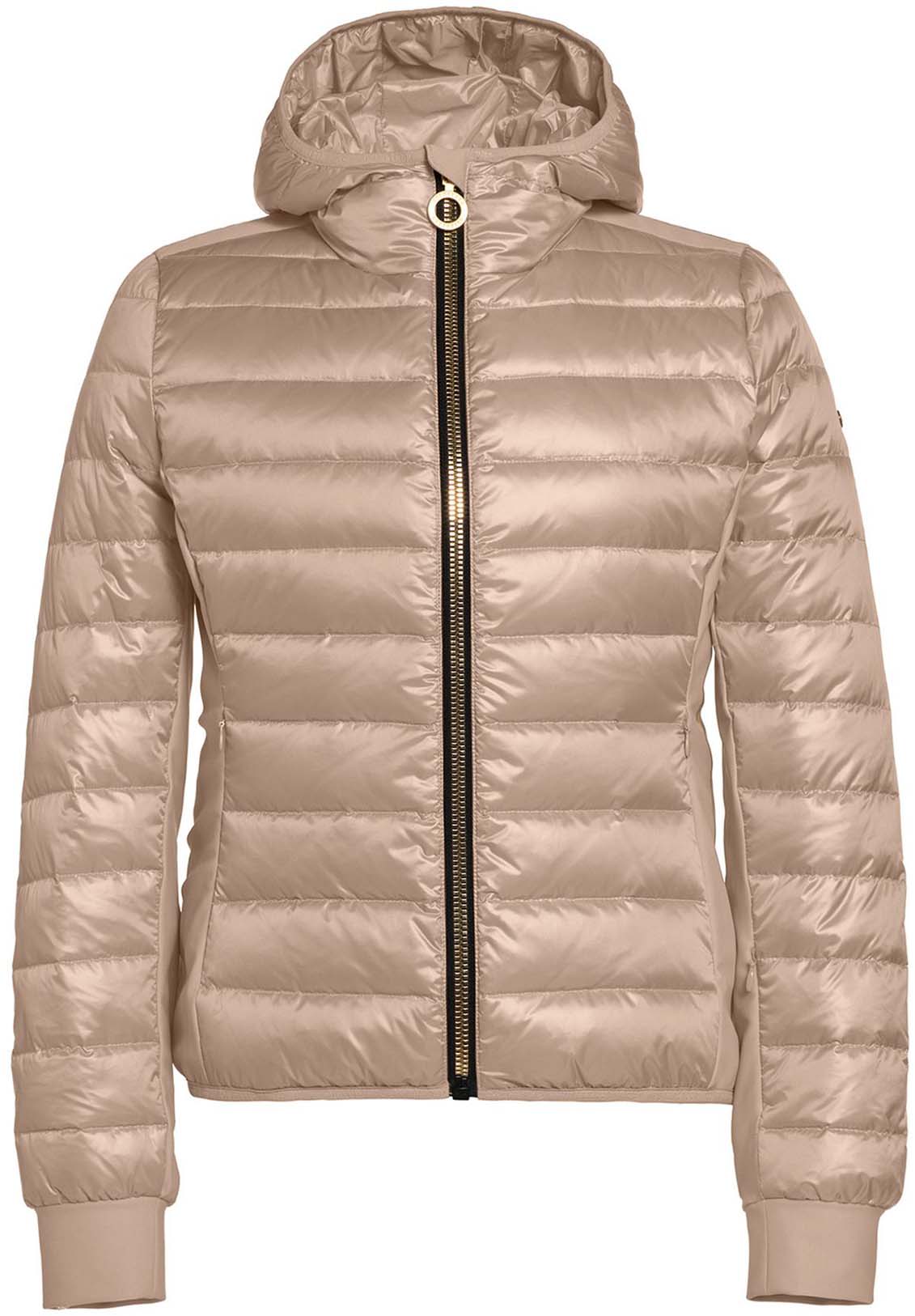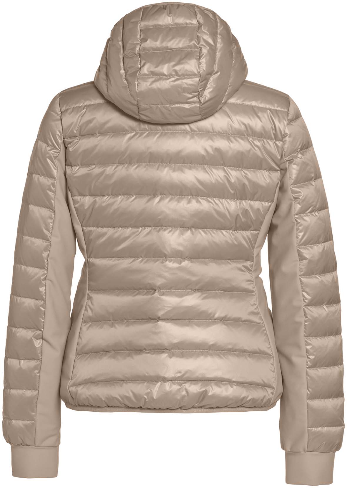 Glimmend donsjack met softshell delen en capuchon