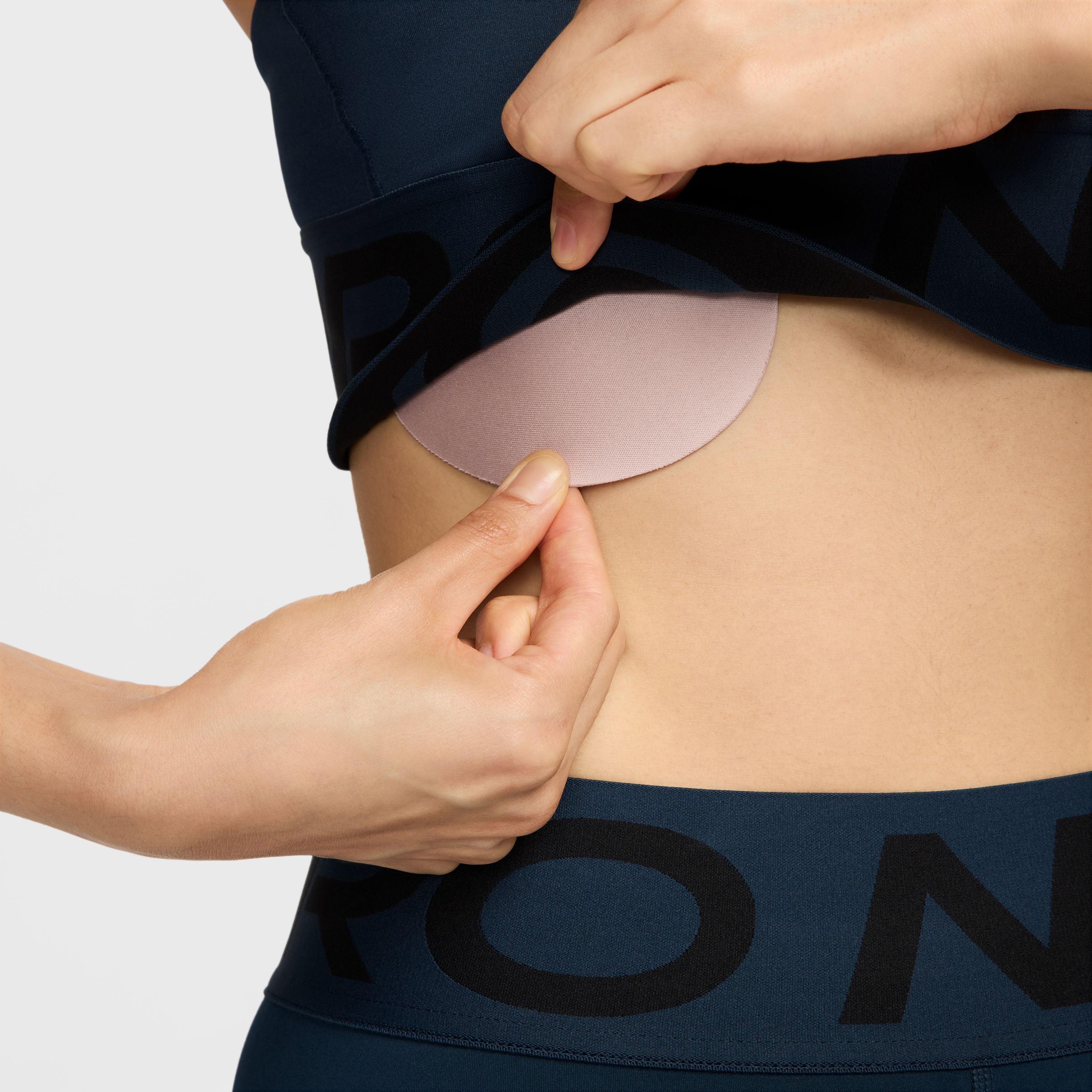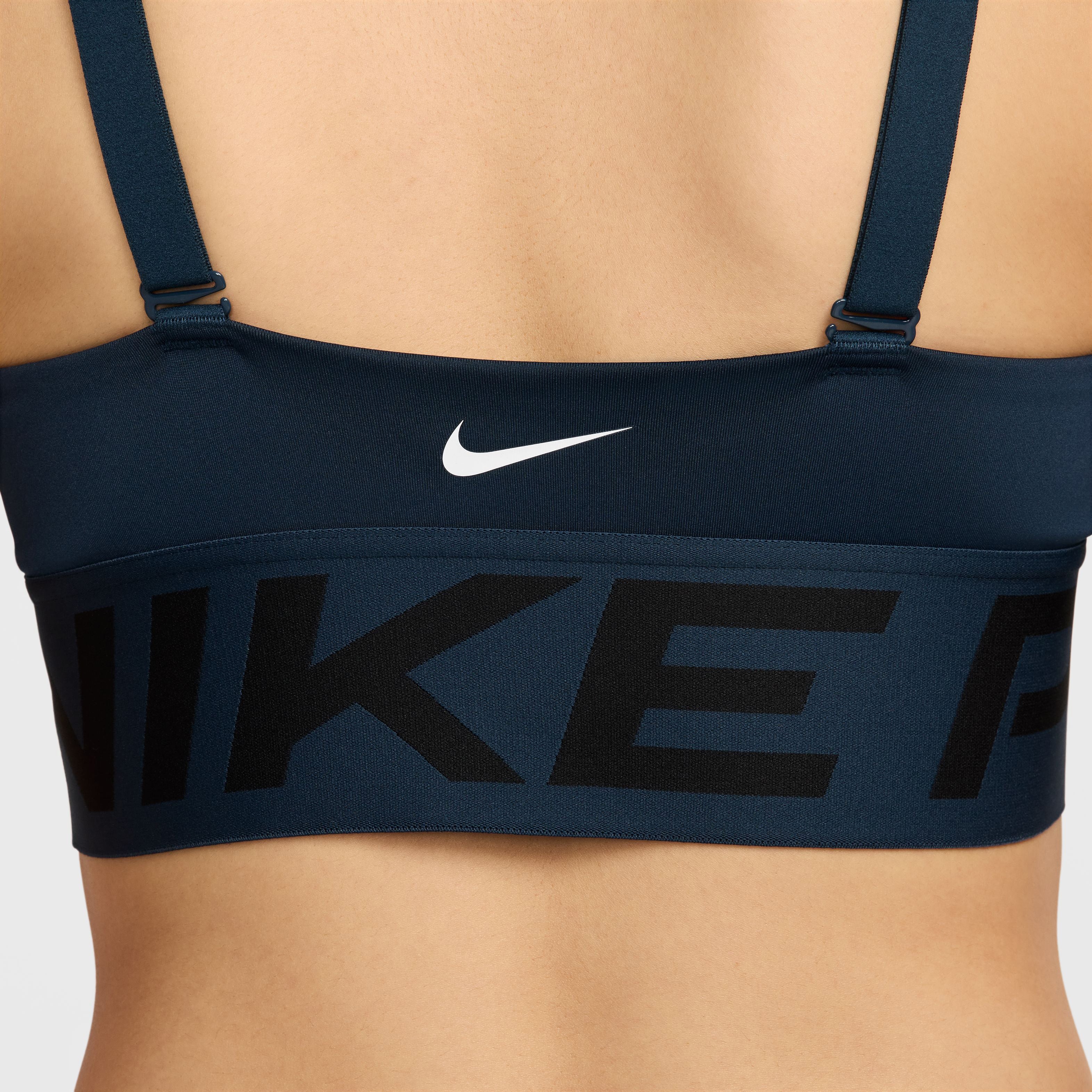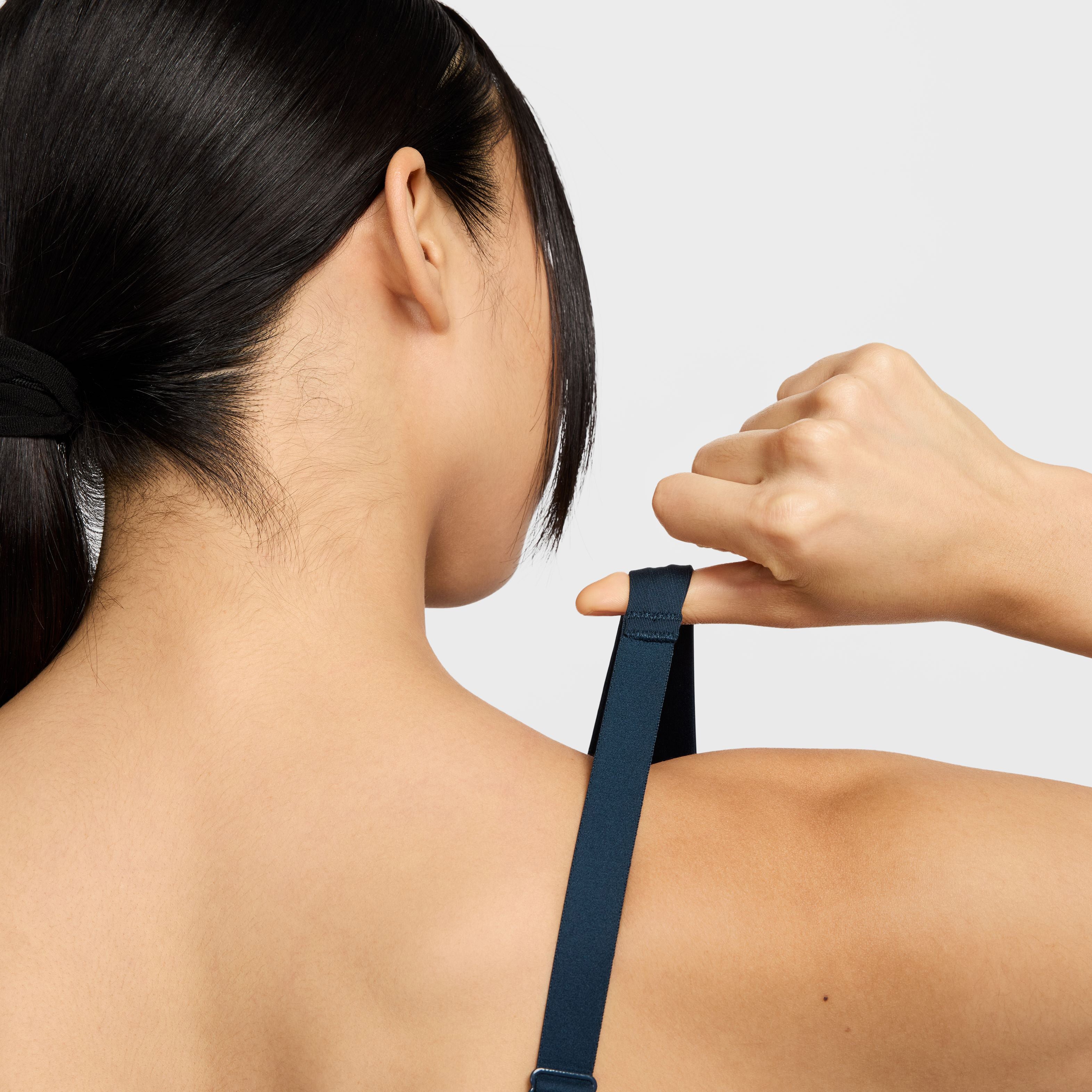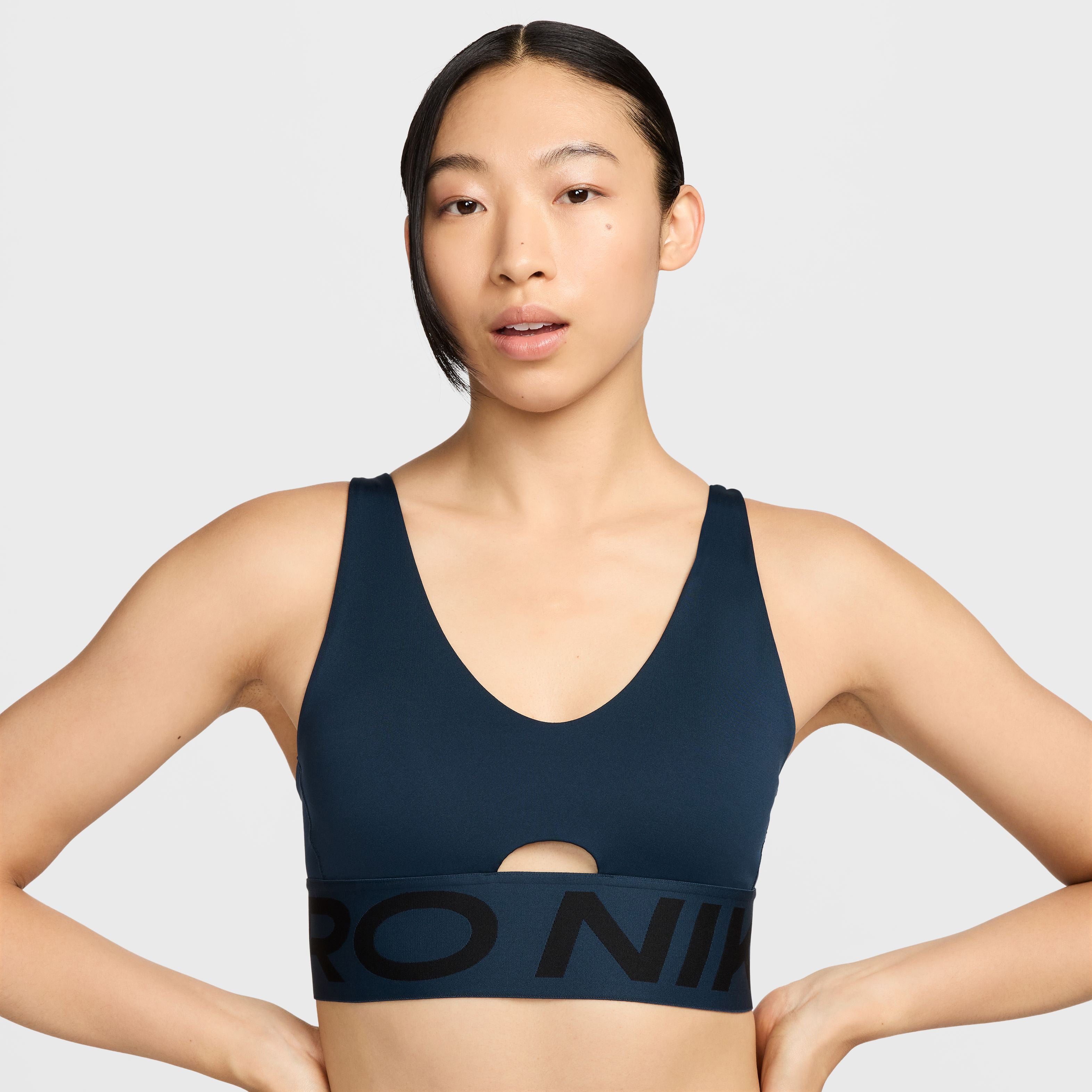 Nike Pro Indy Plunge Padded sport-bh met medium ondersteuning Laat je zien en doe je best in deze opvallende sport-bh met diepe halslijn. Minimale bedekking zorgt nog steeds voor een aansluitende pasvorm die alles op zijn plek houdt, zodat je jezelf kunt blijven pushen. Daarnaast zorgen verstelbare bandjes en uitneembare pads voor de vrijheid om hem op jouw manier te stylen. Net als een Pro Zelfverzekerde stijl past overal bij. Van leggings tot tops tot meer, Nike Pro is klaar om je garderobe aan te vullen met items waarmee je opvalt. Blijf koel Nike Dri-FIT technologie voert zweet weg van de huid voor snellere verdamping, zodat je droog en comfortabel blijft. Een uitsparing middenvoor en een minimalistisch design zorgen voor verbeterde luchtcirculatie. Je kunt de bedekking aanpassen met de uitneembare pads. Met verstelbare bandjes kun je je lengte aanpassen en je kunt ze kruisen voor een veelzijdige stijl. De Nike Pro elastische borstband van jacquardmateriaal zit nauwsluitend zonder te knellen.