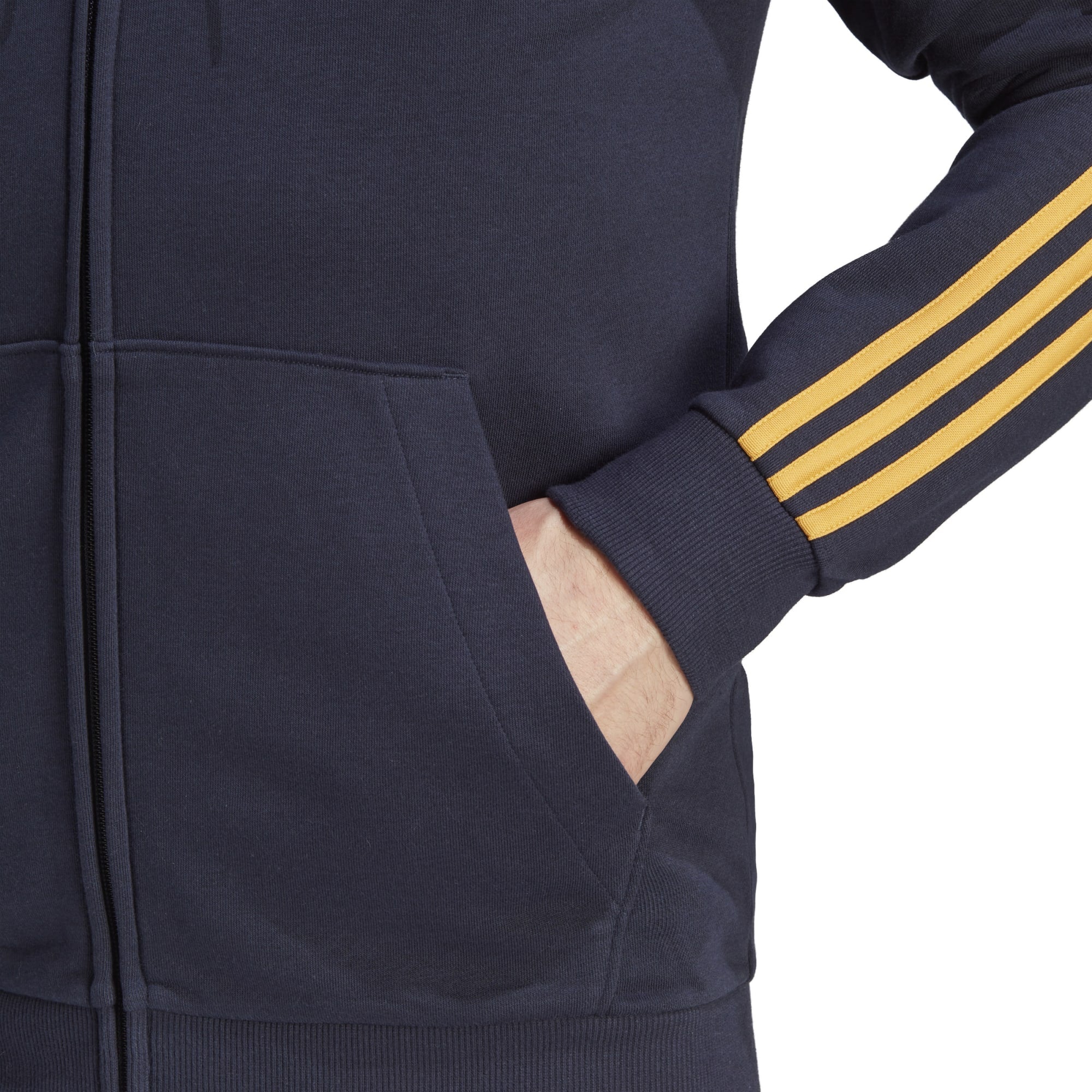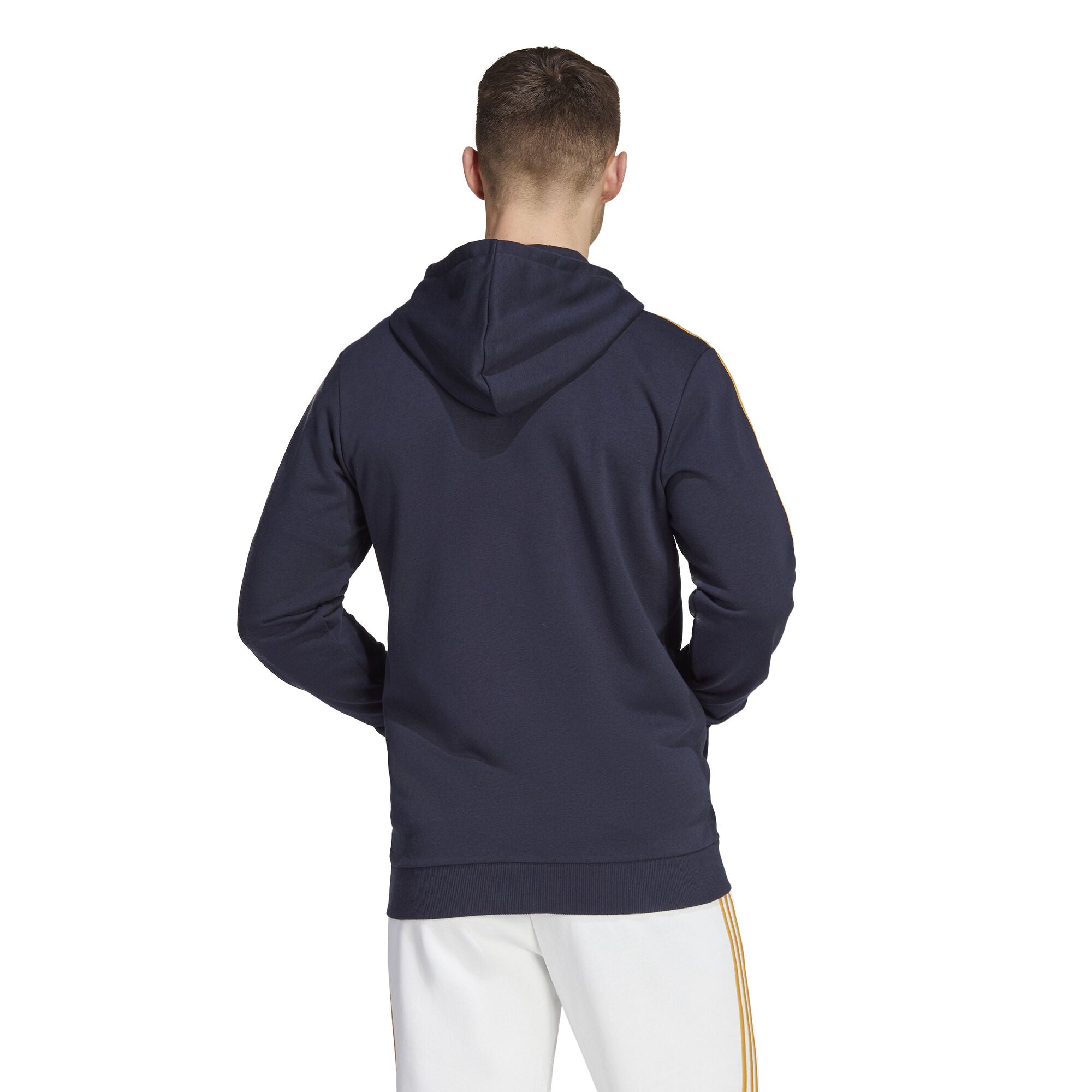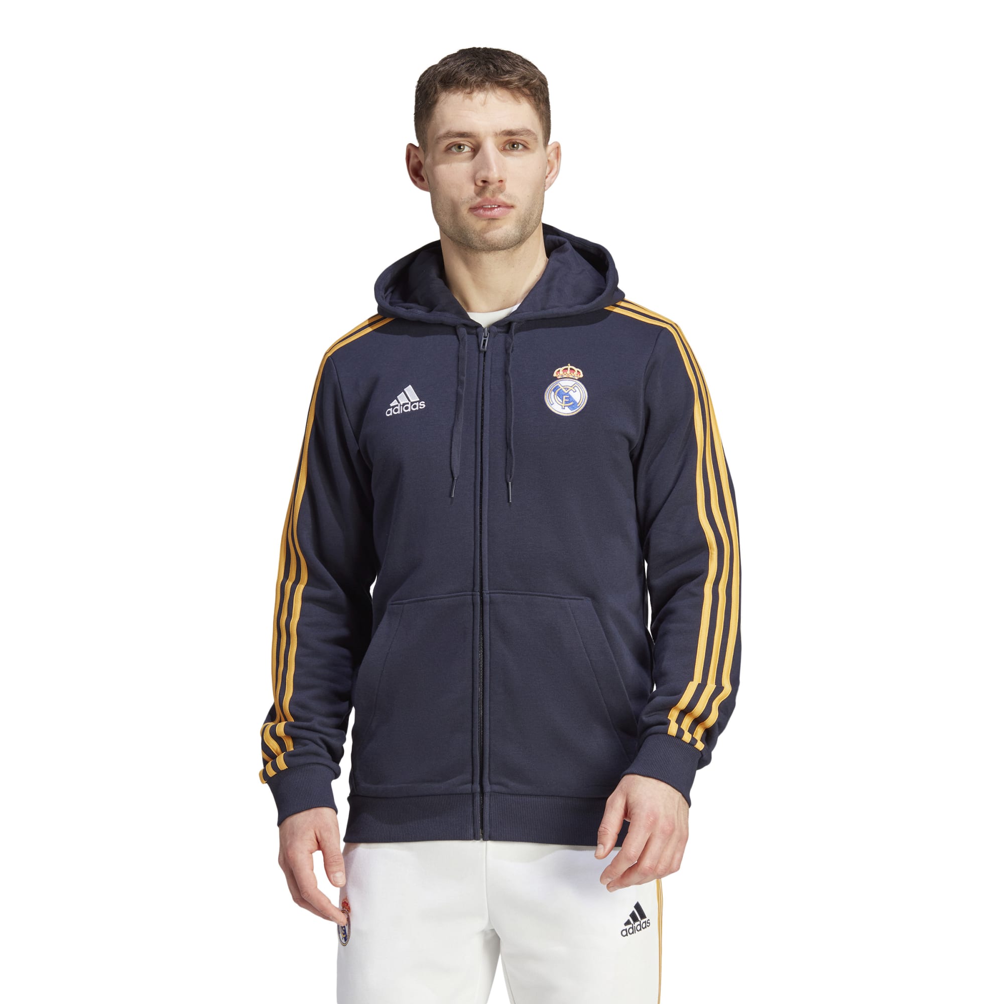 Deze adidas Real Madrid hoodie leent details van het thuistenue, zoals de gouden 3-Stripes op de schouders. Trek 'm aan over je geliefde thuisshirt voor de perfecte combinatie. De zachte sweaterstof, een gevoerde capuchon en de diepe kangoeroezak houden je comfortabel, of je nu naar de grote wedstrijd kijkt of relaxt op een voetbalvrije dag.
