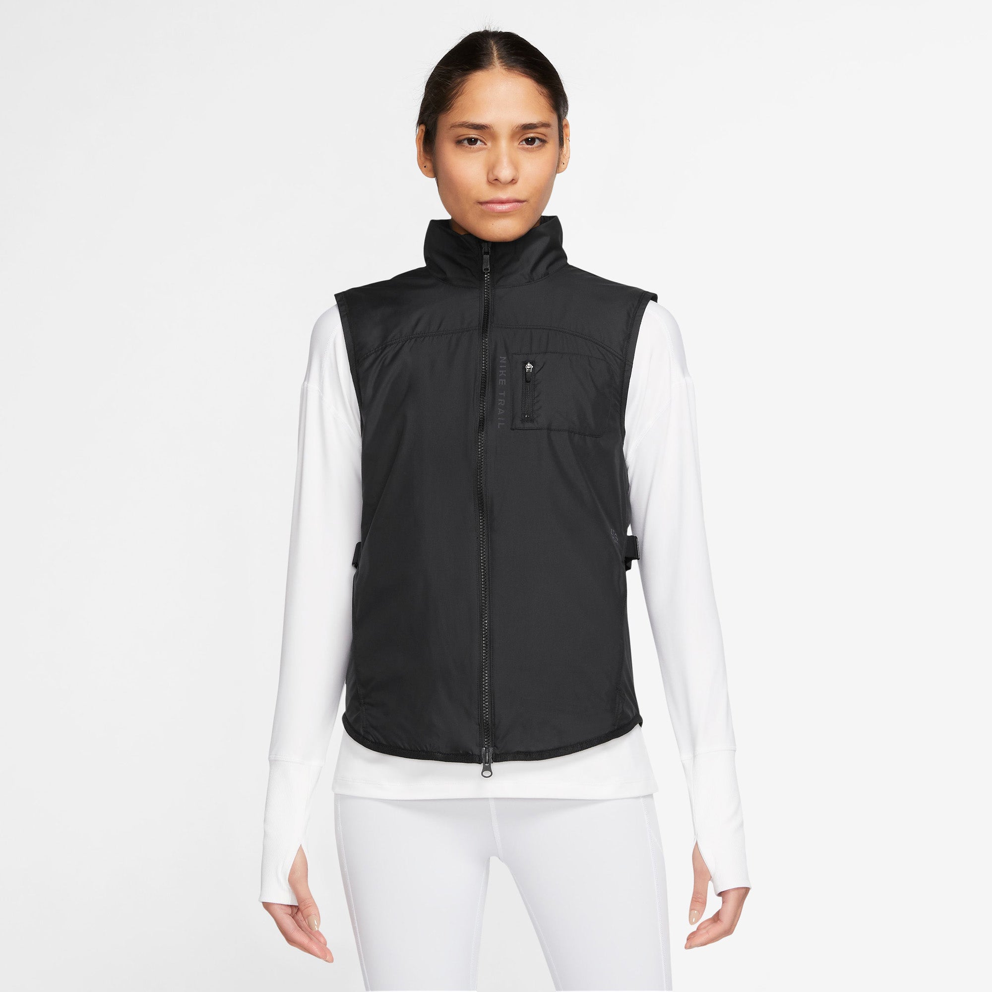 Nike Repel Bodywarmer voor trailrunning voor dames Laat de straten achter je en ontdek de natuur in deze lichte, waterafstotend bodywarmer. Ontworpen om je warm, droog en comfortabel te houden als je de stress van je af loopt. Dankzij de ronde zoom kun je je vrij bewegen en bedekking aan de voor- en achterkant bieden tijdens je volledige run. Maak de bandjes aan de zijkant strak voor een persoonlijke pasvorm en voel je helemaal voorbereid met meer dan genoeg zakken, waaronder twee die groot genoeg zijn voor waterflessen, zodat je kunt blijven doorgaan. Blijf beschermd De waterafstotende afwerking houdt je droog in nat weer. Wees voorbereid Twee steekzakken aan de achterkant met elastische zoom aan de bovenkant bieden snelle toegang tot items die net zo groot zijn als een bidon. In de 3 ritszakken kun je kleine spullen veilig opbergen, zoals pasjes, sleutels of telefoon. Kies je pasvorm Met de verstelbare bandjes aan de zijkanten kun je de taille aantrekken of los laten vallen. Lichte knit voering biedt extra warmte. Ritssluiting in twee richtingen biedt een veelzijdige stijl.