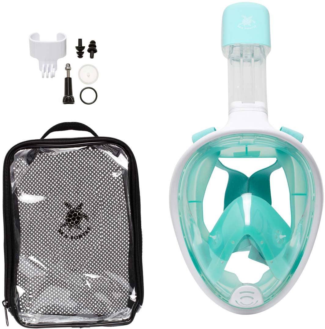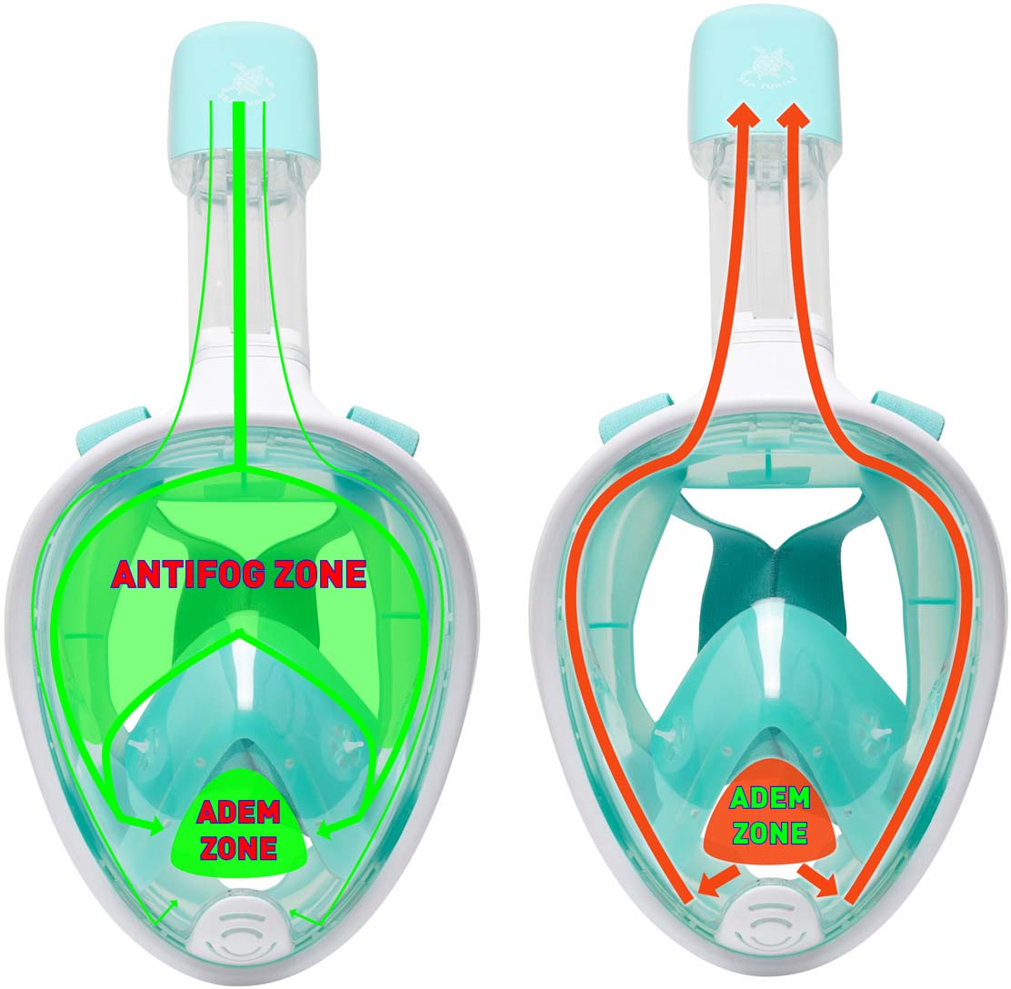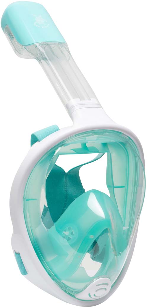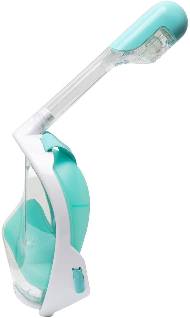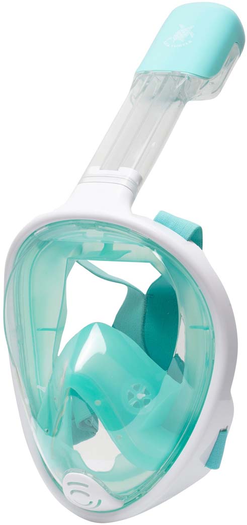 Nieuwsgierig naar het snorkelen met een Full Face masker en zou je het graag eens willen proberen? Dan is het SeaTurtle snorkelmasker perfect geschikt voor jou! Het SeaTurtle Full Face snorkelmasker maakt ademen onderwater net zo gemakkelijk als ademen boven water en dat met 180 graden zicht! Komt er een flinke golf over je snorkel? Dan wordt het water buiten gehouden door de Dry-Top technologie. Wanneer er toch een beetje water binnen komt loopt dit vanzelf weg door het ventiel aan de onderzijde van het snorkelmasker. De hoofdband is gemaakt van soepel elastiek en is gemakkelijk op maat af te stellen.