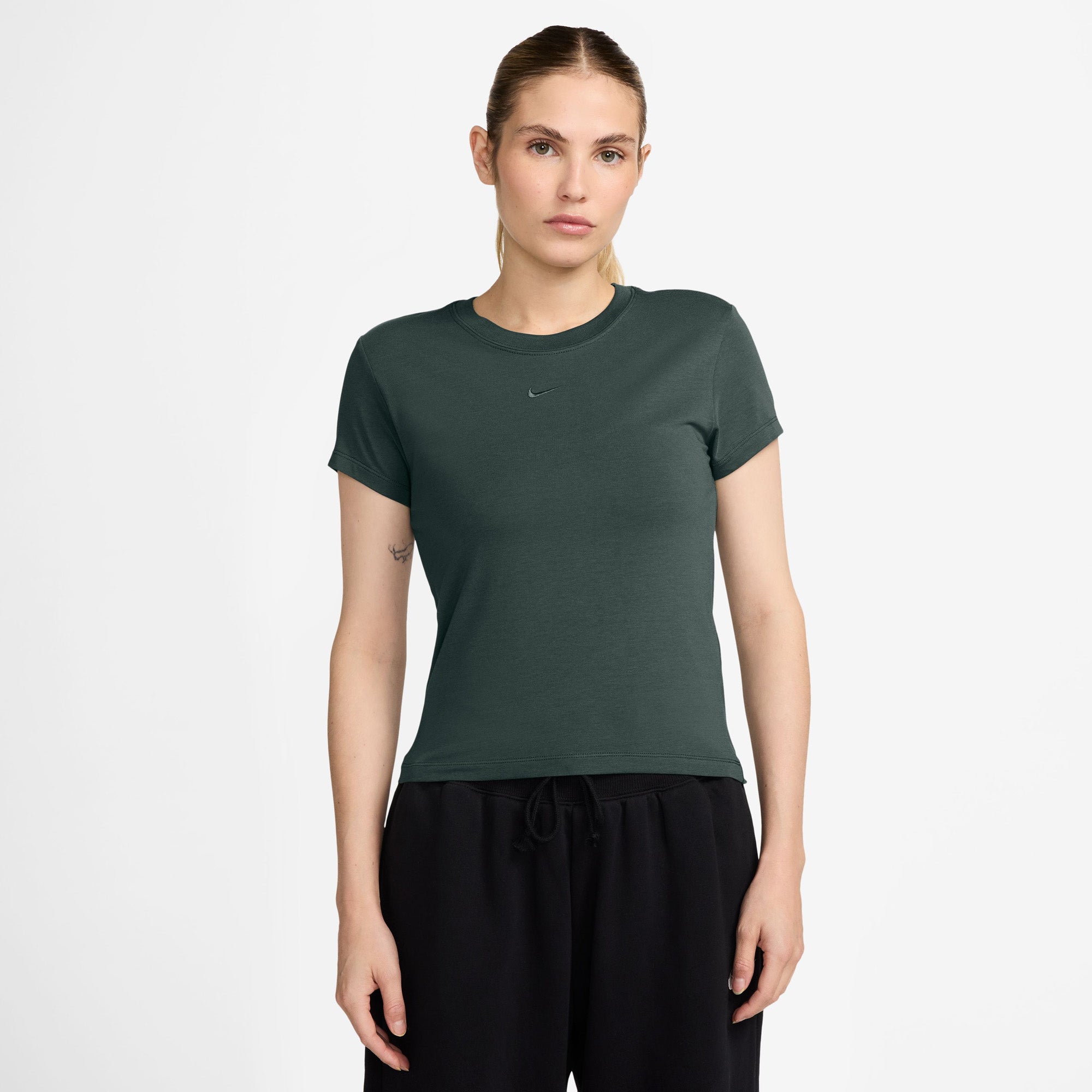 Dit iets kortere T-shirt is klassiek, veelzijdig en perfect voor elke dag. Onze soepele jersey voelt stretchy aan en is licht geplooid, waardoor het niet te losjes en niet te strak zit.