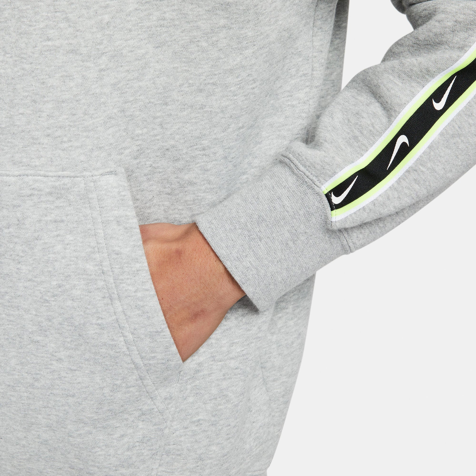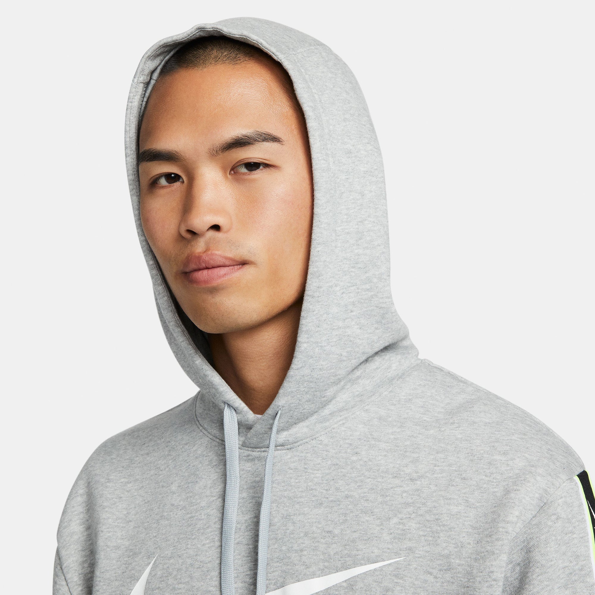 Nike Sportswear Repeat fleece hoodie voor heren Verhef je dagelijkse look met de frisse, minimalistische stijl van dit kledingstuk. Zachte fleece is de knusse laag waar je van houdt, terwijl Swoosh-ontwerpen op repeat een gestroomlijnde look geven. Fleece voelt superzacht aan en voelt licht pluizig aan de binnenkant, zodat je warm en comfortabel blijft. Capuchon met trekkoord zorgt voor verstelbare bedekking wanneer je het nodig hebt. Kangoeroezak geeft je een gemakkelijke plaats om je essentials of je handen in op te bergen. Geribbelde manchetten en zoom helpen de hoodie op zijn plaats te houden terwijl je beweegt.