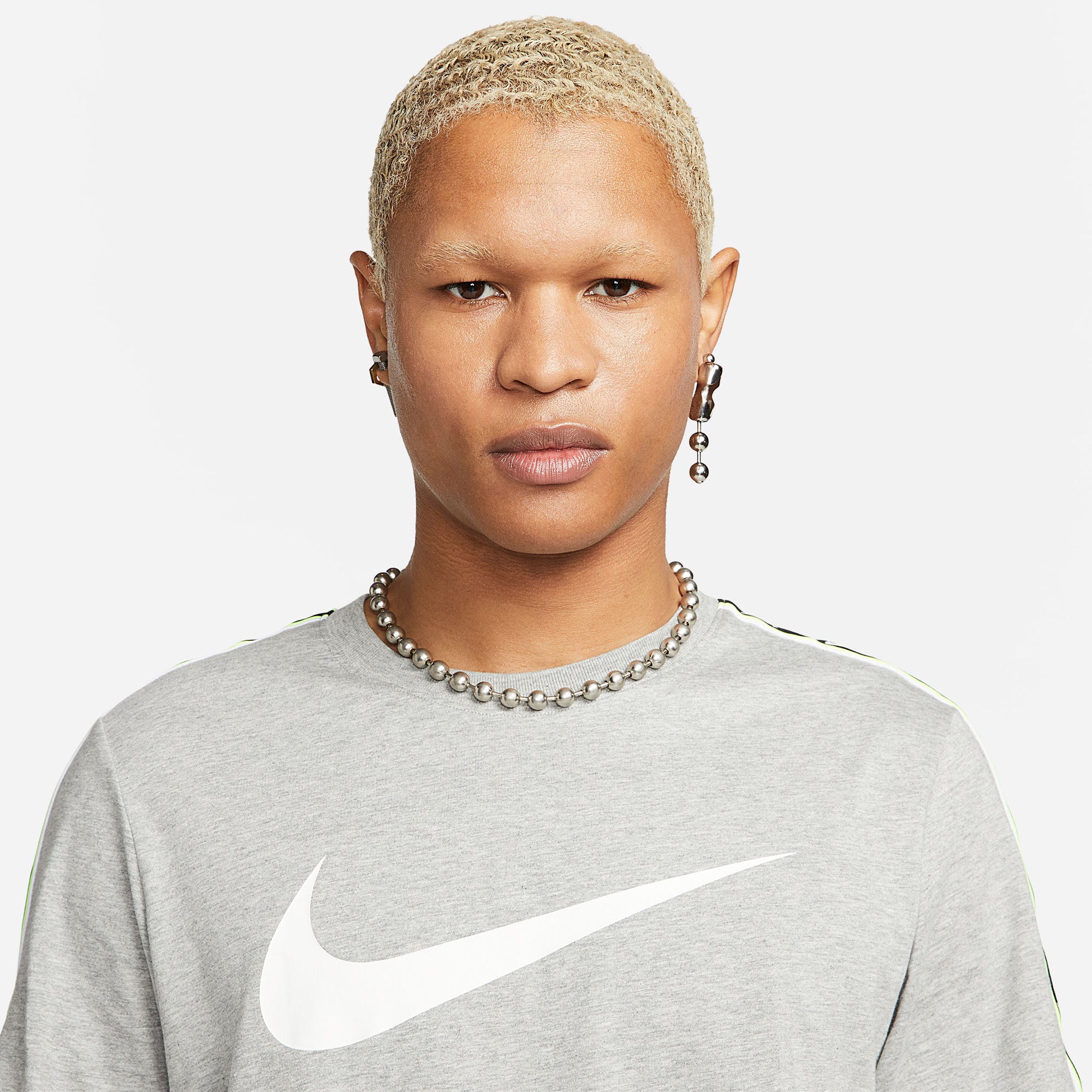 Nike Sportswear Repeat T-shirt voor heren Houd het klassiek met een Swoosh-ontwerp. Een gestroomlijnde band van herhalende logo's tilt dit klassiek gesneden kledingstuk naar een hoger niveau, terwijl zacht, ademend katoen ervoor zorgt dat het aanvoelt als een oude favoriet op de allereerste keer dat je hem draagt. Niets zegt zo klassiek T-shirt als 100% zacht katoen. De geribbelde ronde hals is duurzaam en toch comfortabel.