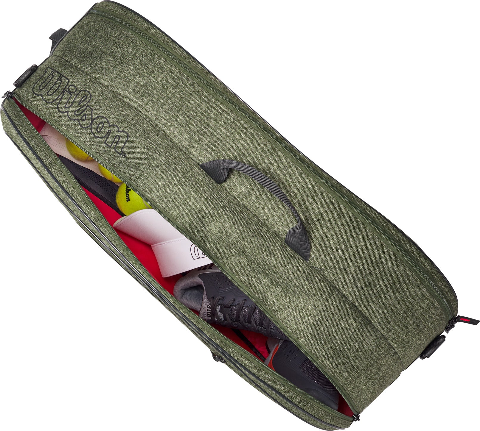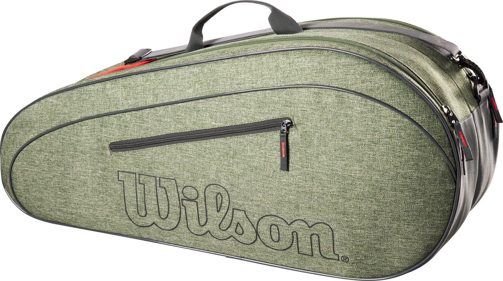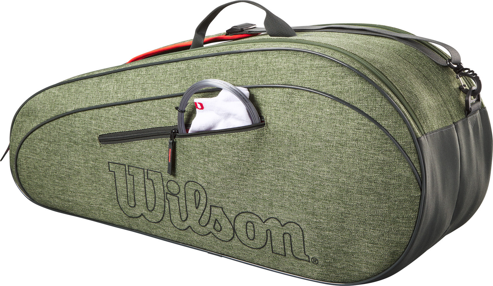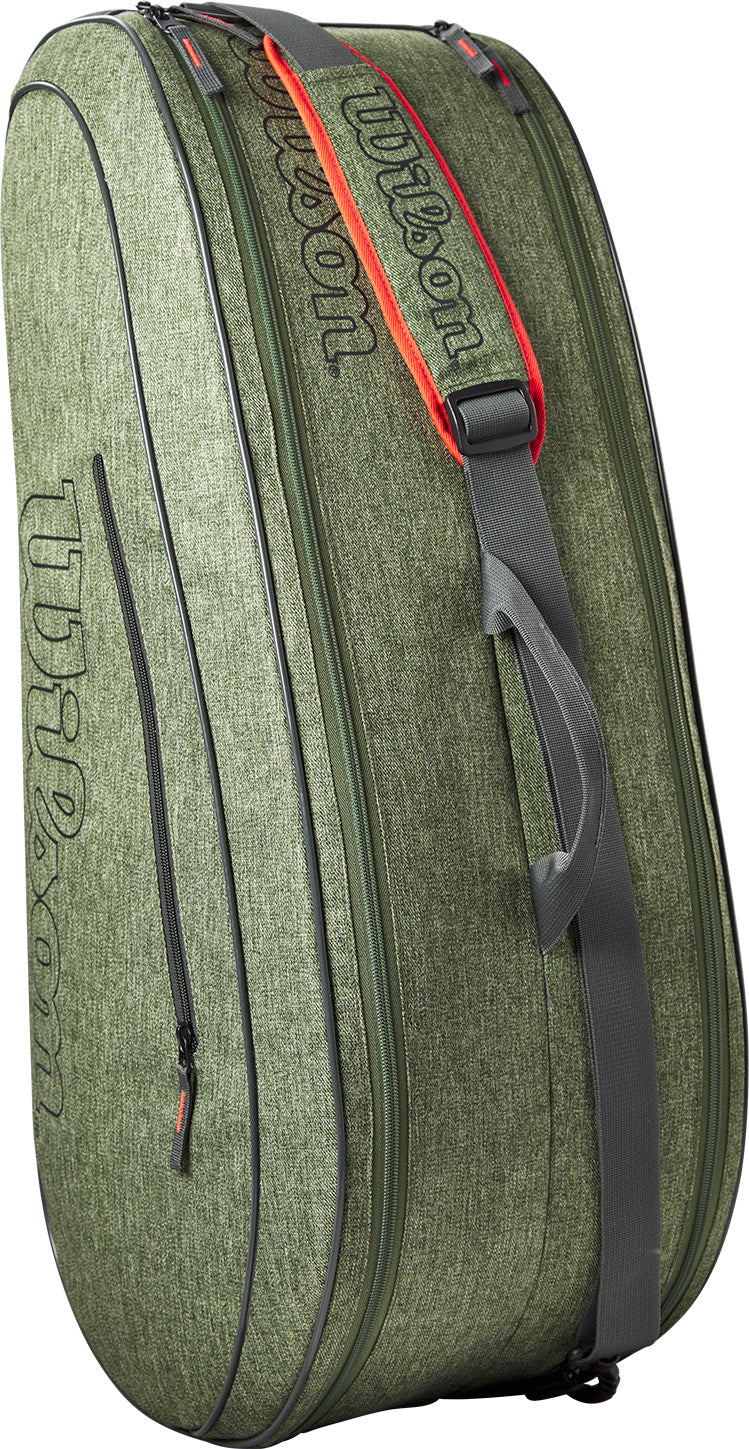 Wilson's Team 6-Pack is een geweldige tas voor clubspelers die ruimte nodig hebben voor meerdere tennisrackets, kleding en andere spullen. De twee hoofdcompartimenten bieden plaats aan maximaal zes rackets, plus een groot buitenvak met ritssluiting voor extra ballen, grips en snacks. Draag hem aan de handgrepen aan de bovenkant of de gewatteerde schouderbanden.