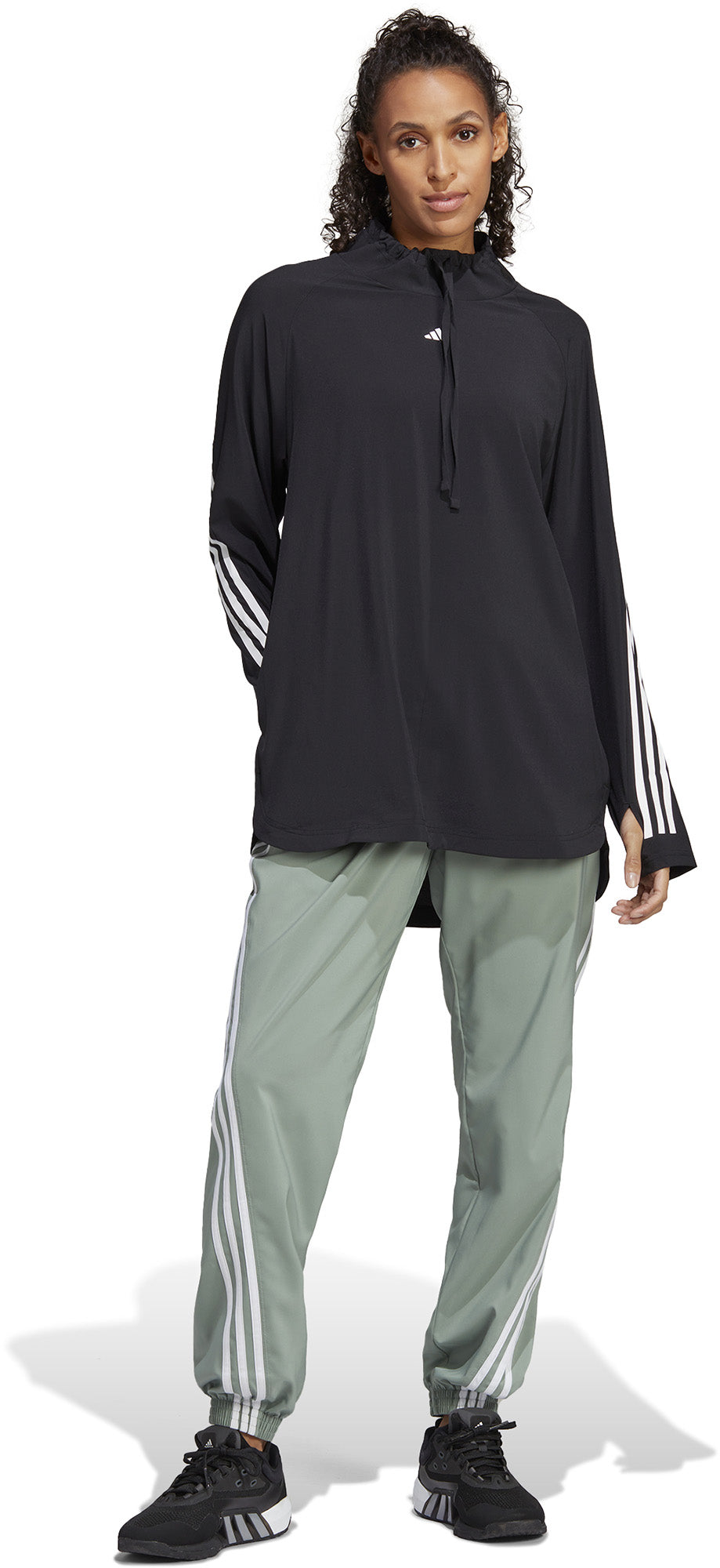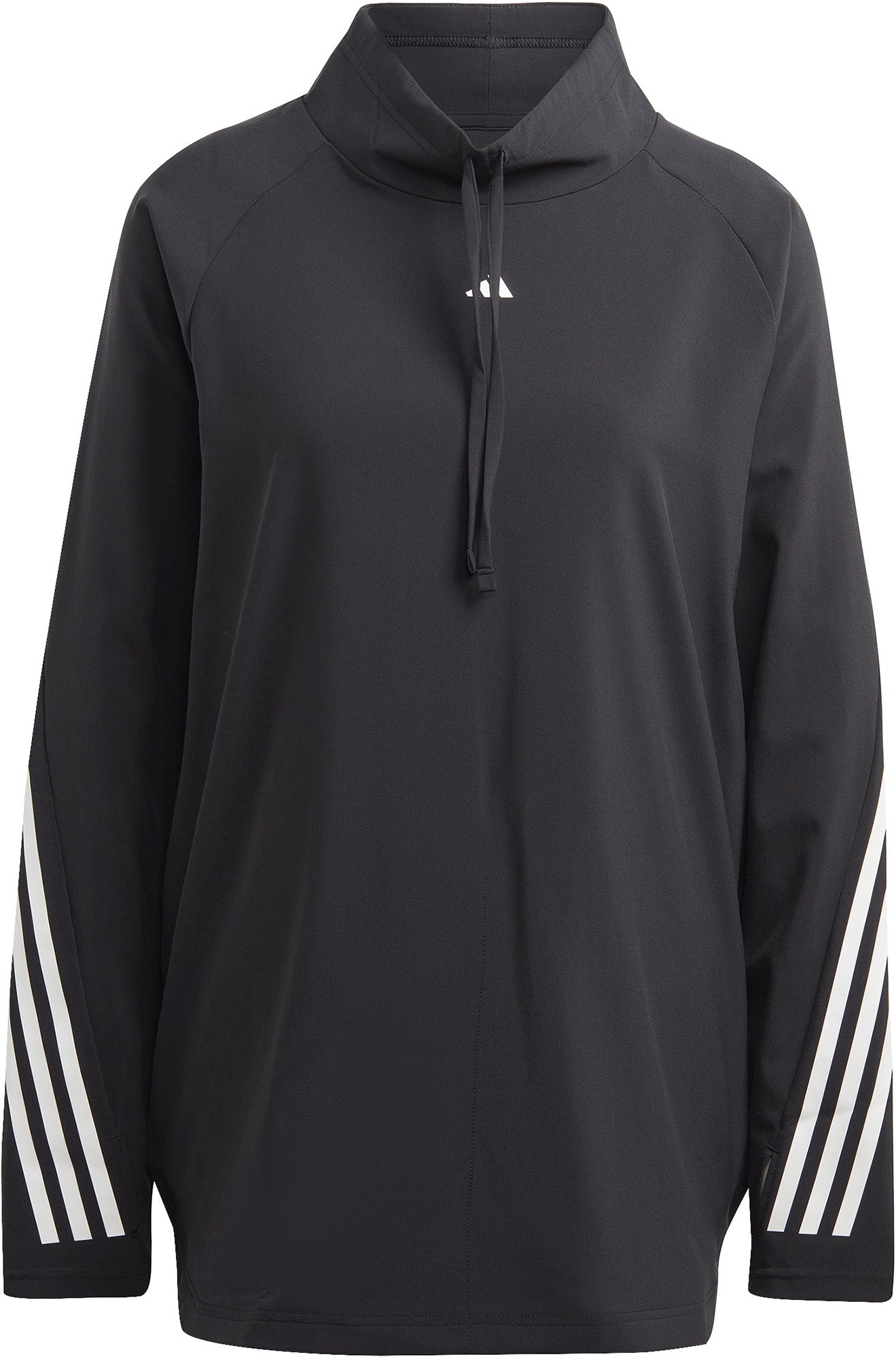 Of je nu je warming-up doet of wacht tot er een roeimachine vrijkomt, in deze adidas sweater blijf je droog en zelfverzekerd. De opstaande kraag, lange mouwen en extra lange body houden je bedekt. AEROREADY reguleert vocht, waardoor je van eerste tot aller-, állerlaatste (oké, nog eentje dan) rep droog blijft.