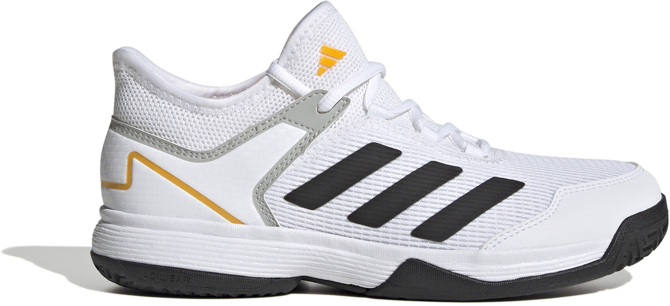Snelheid wint tijd. Tijd scoort punten. Daarom zijn deze adidas adizero Ubersonic 4 tennisschoenen ontworpen om kinderen sneller bij de bal te krijgen. Het comfortabele bovenwerk van mesh heeft een gepolsterde hiel om voeten klemvast te zetten voor bliksemsnelle sprints. EVA-middenzooldemping maakt landingen zachter en een stroeve Adiwear-loopzool verbetert snelheid op verschillende ondergronden.