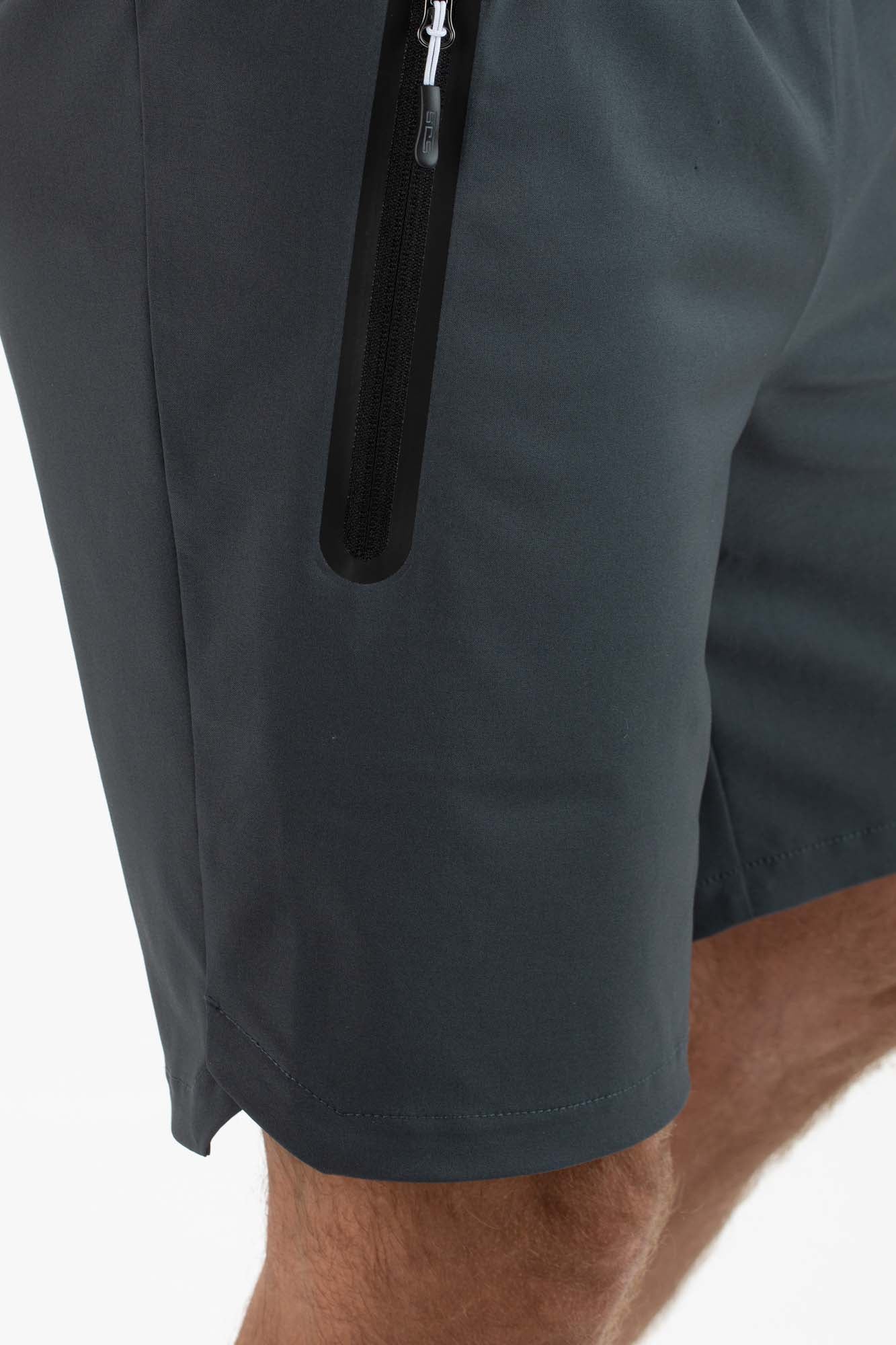 Comfortabel heren trainingsshort van zwart, horizontaal geweven, stretch materiaal. Deze short heeft een elastische tailleband met een strikkoord en twee steekzakken met ritssluitingen.