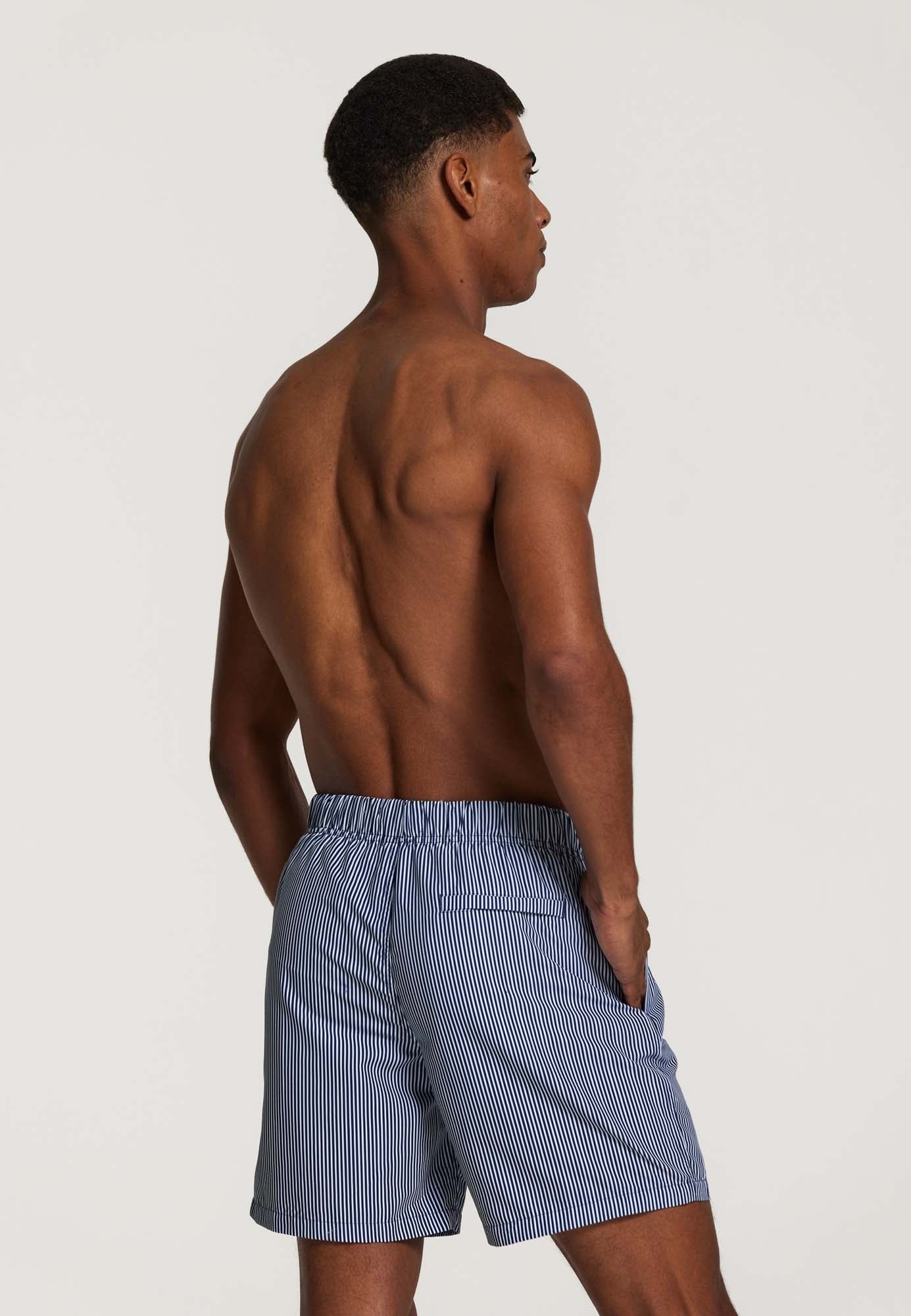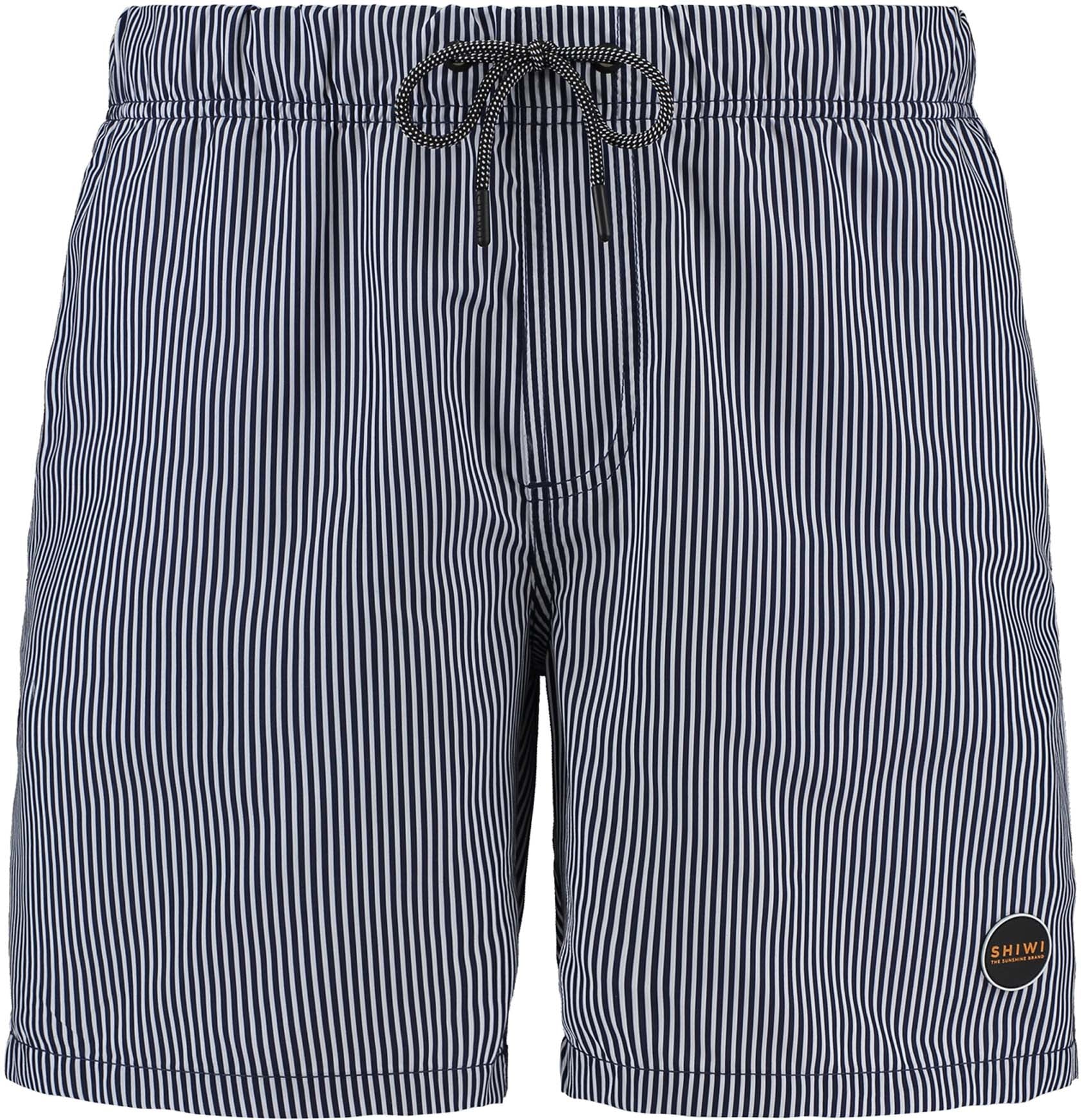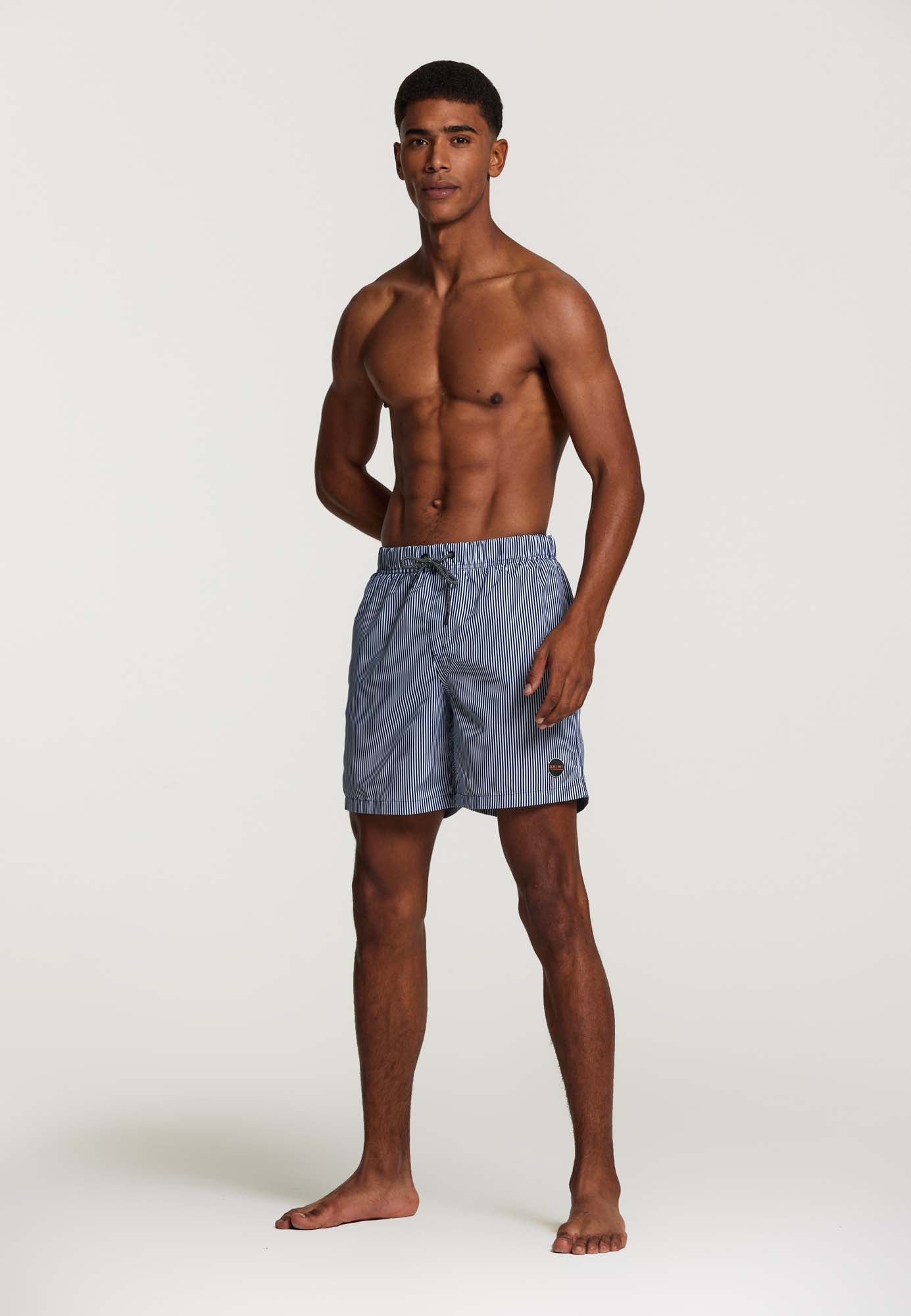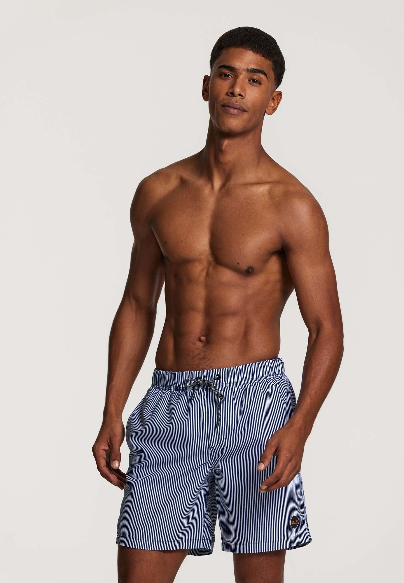 Deze skinny gestreepte normale lengte zwemshort heeft een elastische tailleband met trekkoord en handige achter- en zijzakken. De short is gemaakt van 100% gerecycled materiaal dat makkelijk droogt.
